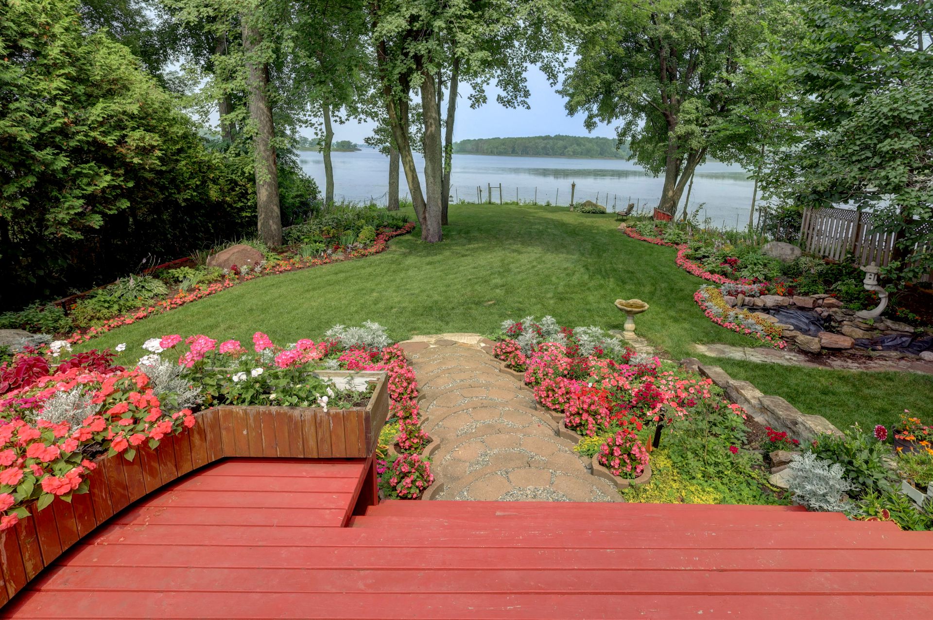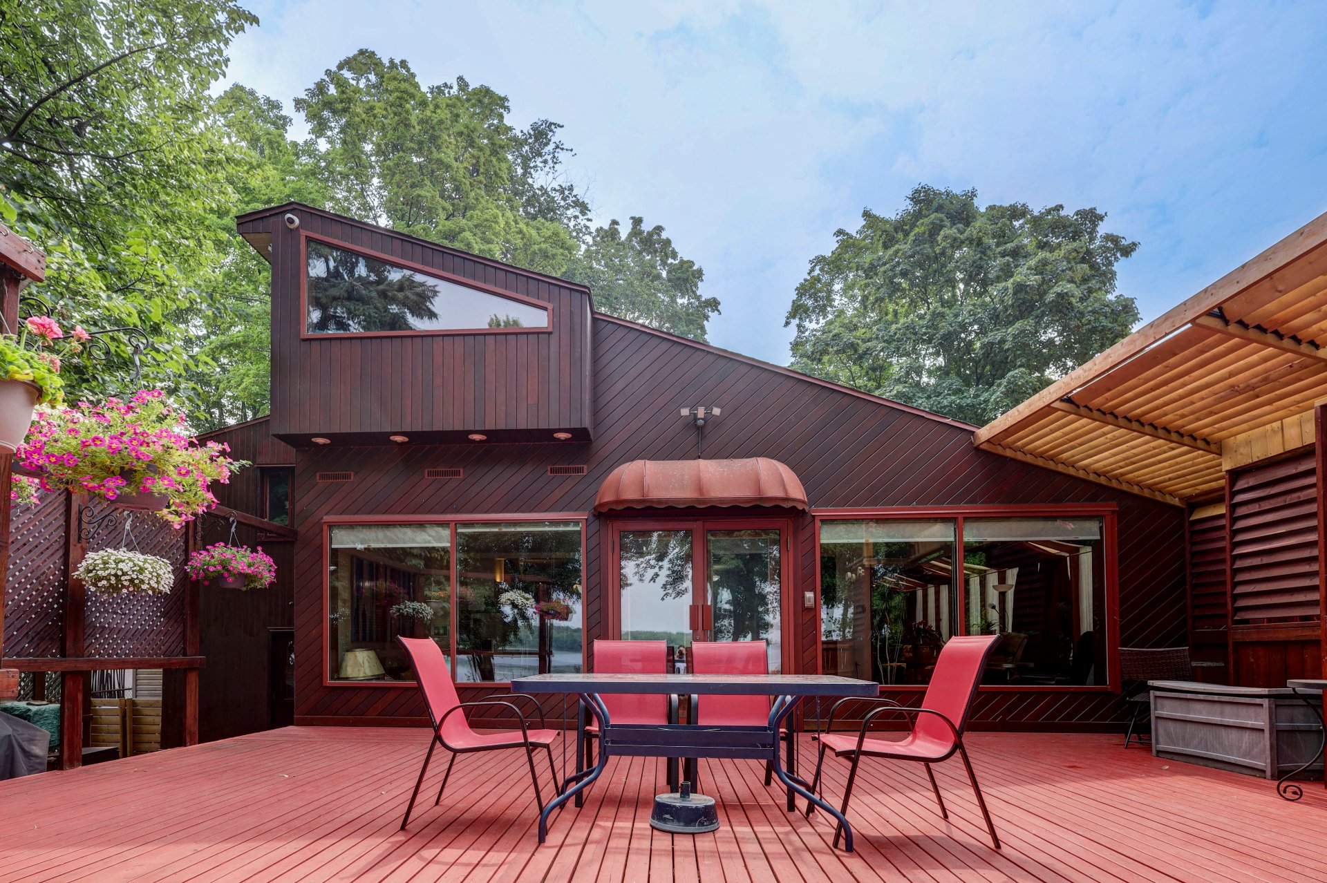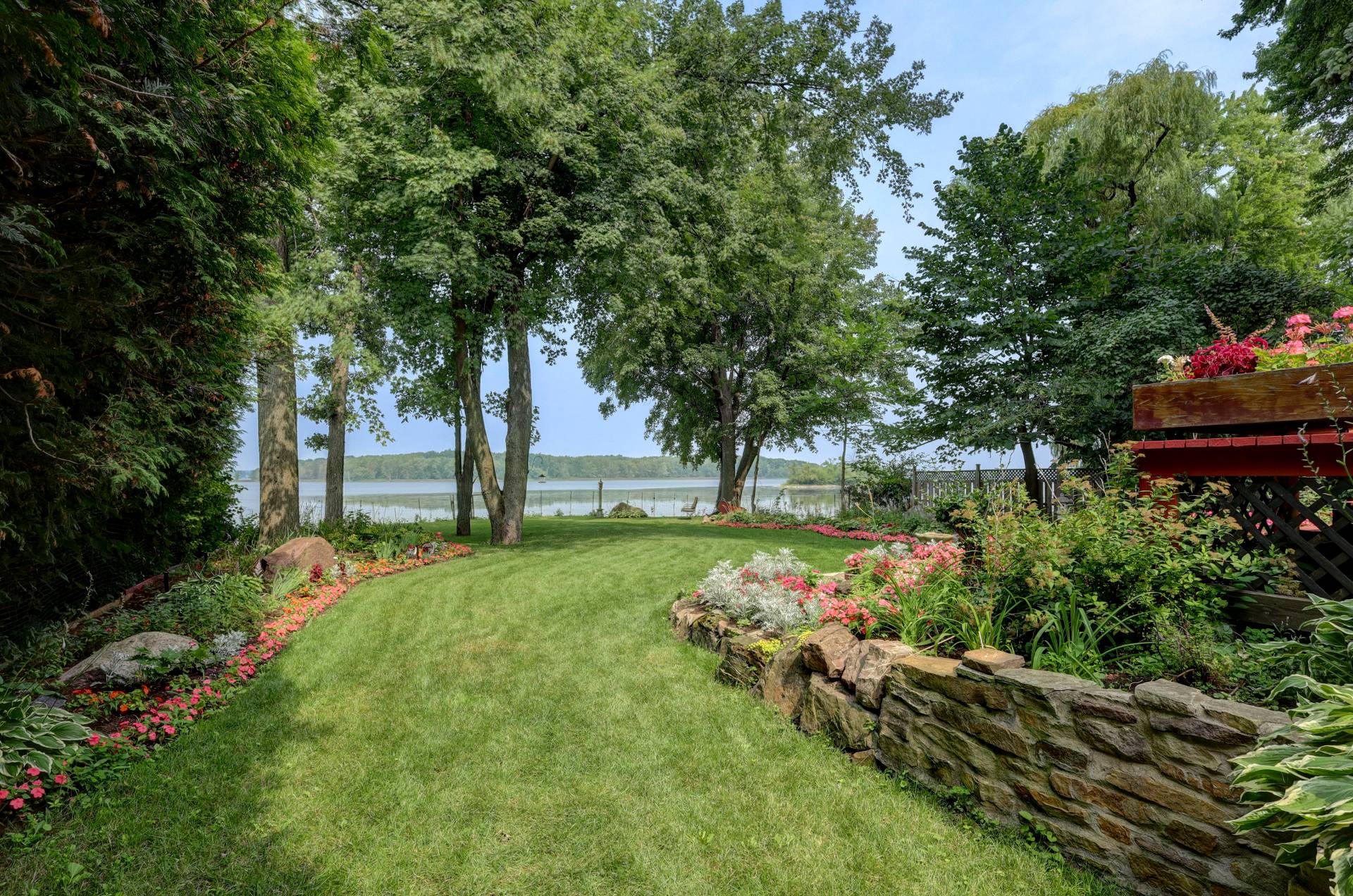 Des portes doubles du salon et du bureau s'ouvrent sur un jardin paysager minutieusement entretenu, avec une terrasse en bois de 27'x16' et un patio en pierres de rivière au niveau inférieur. La propriété inclut également un système d'irrigation unique qui puise son eau directement du lac.