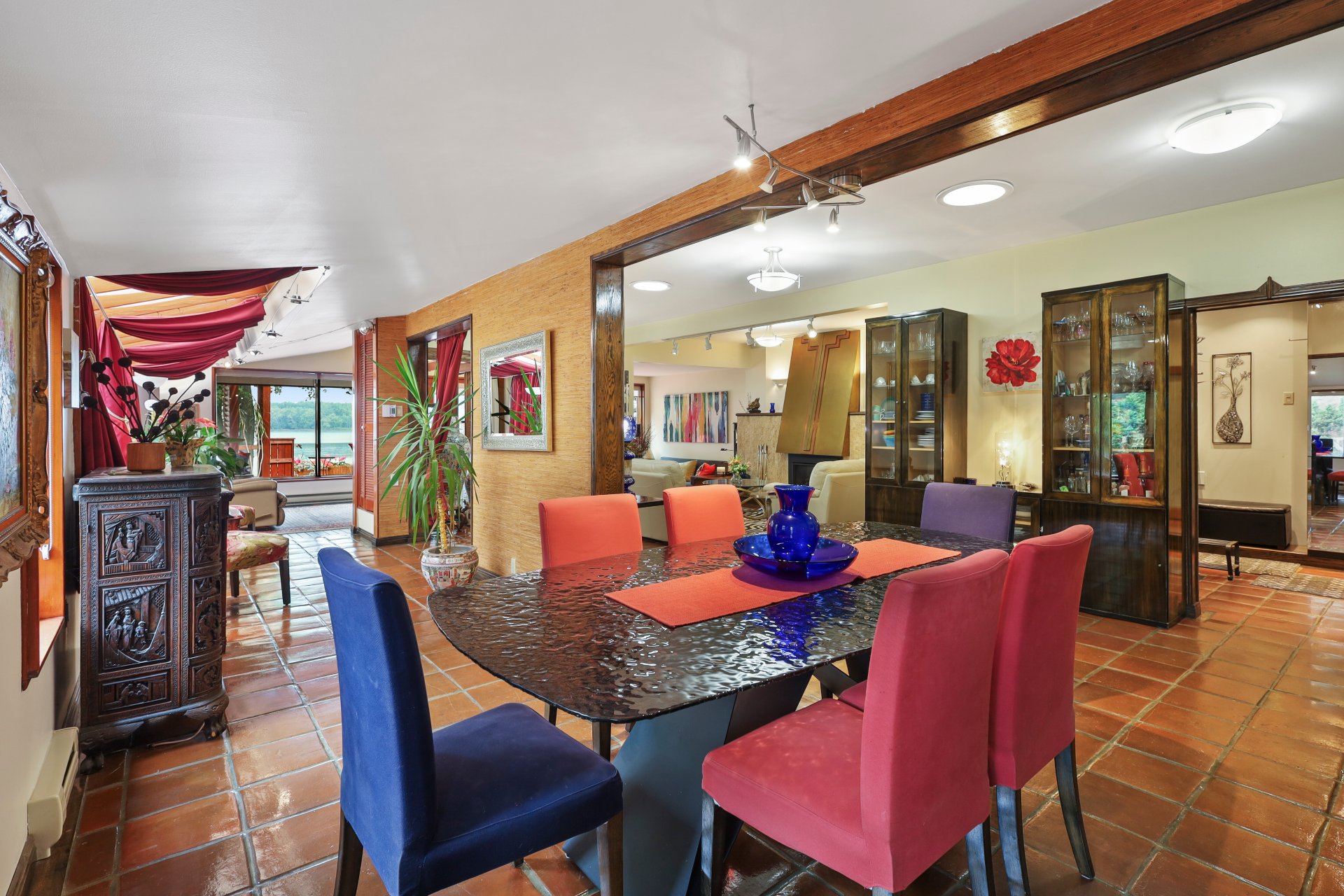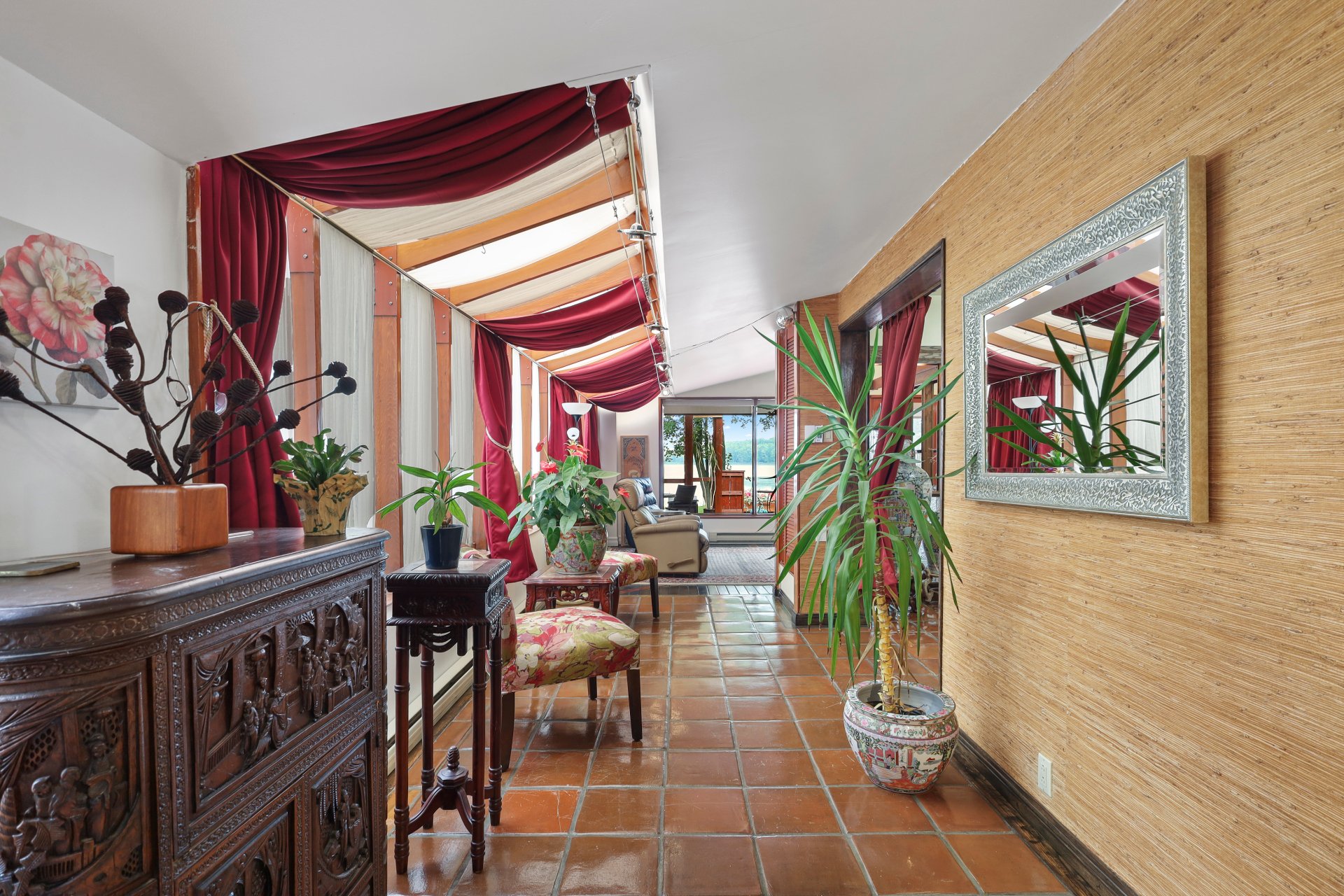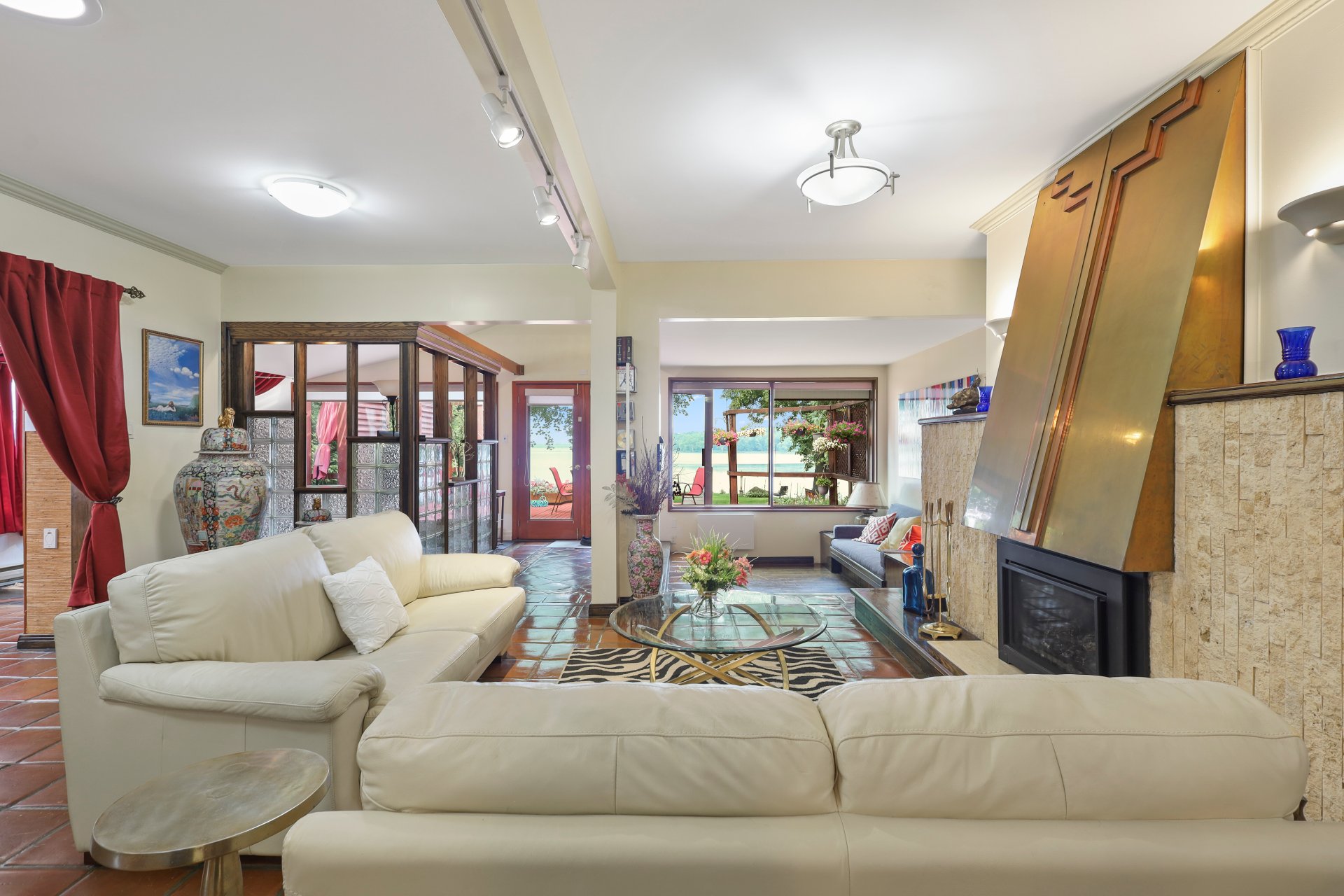 Le rez-de-chaussée présente des sols en terre cuite, des portes en bois sur mesure avec des vitres gravées, et un aménagement à aire ouverte avec de magnifiques vues sur l'eau. Le spacieux salon est agrémenté d'une cheminée au gaz et d'un coin salon en contrebas (8'11 x 9'10) avec des planchers de bois franc. La salle à manger s'ouvre sur une solarium, et un bureau confortable avec des murs en brique de verre offre des vues apaisantes sur l'extérieur.