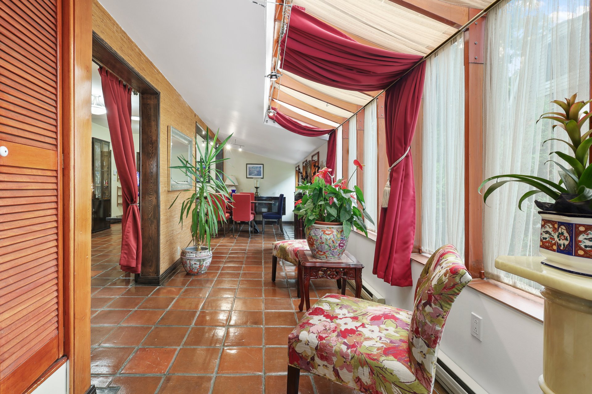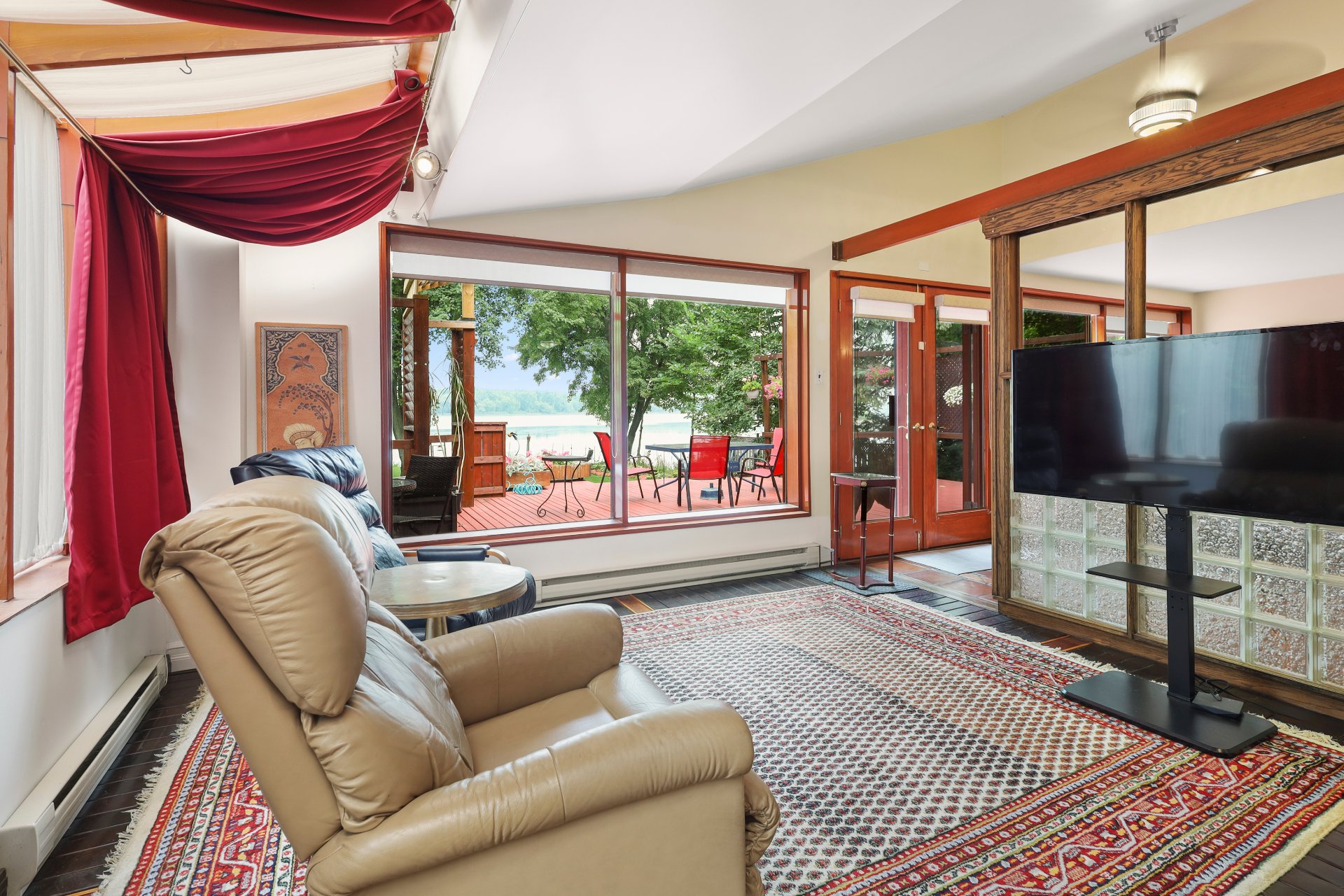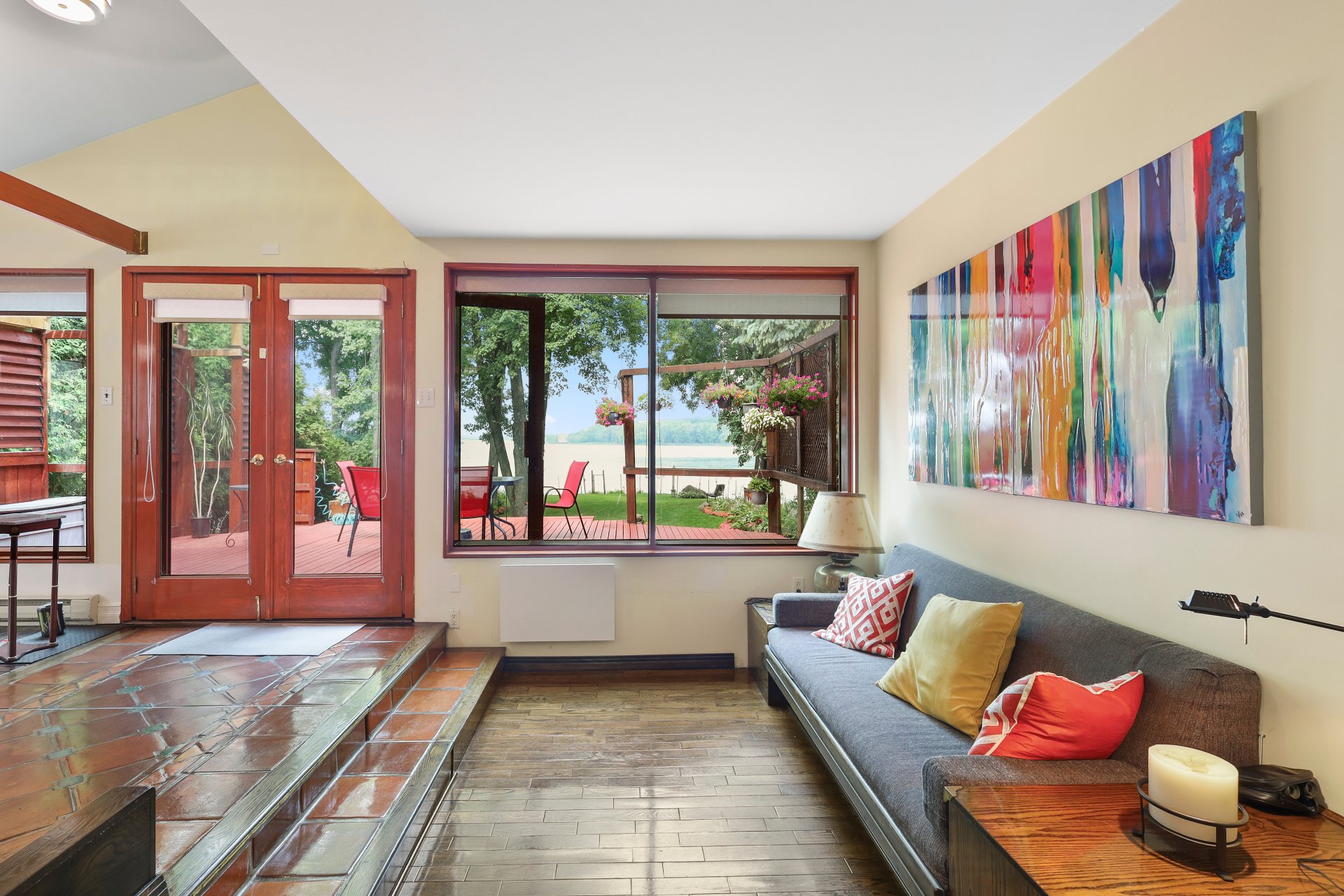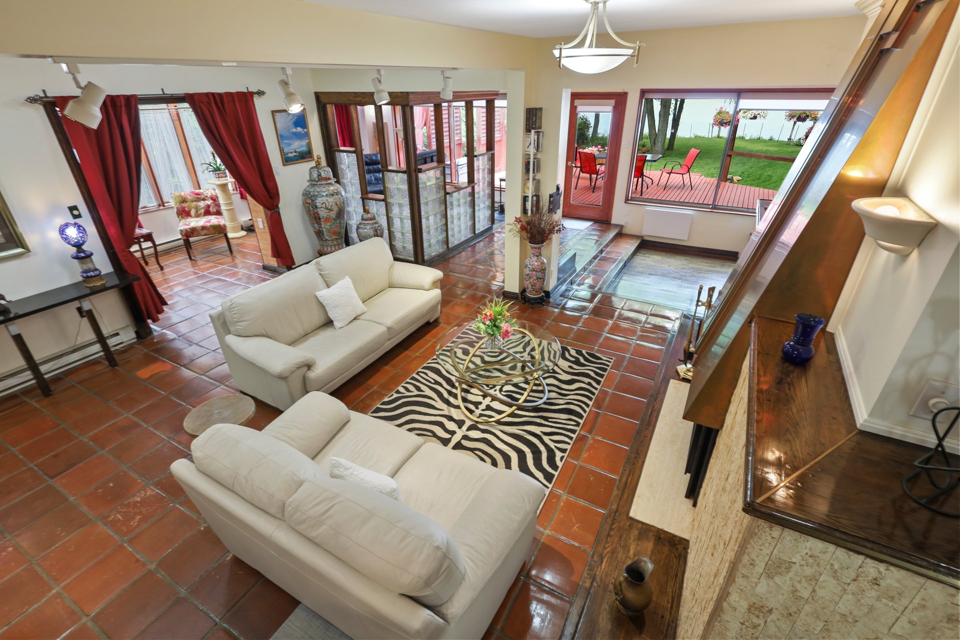 Le rez-de-chaussée présente des sols en terre cuite, des portes en bois sur mesure avec des vitres gravées, et un aménagement à aire ouverte avec de magnifiques vues sur l'eau. Le spacieux salon est agrémenté d'une cheminée au gaz et d'un coin salon en contrebas (8'11 x 9'10) avec des planchers de bois franc. La salle à manger s'ouvre sur une solarium, et un bureau confortable avec des murs en brique de verre offre des vues apaisantes sur l'extérieur.