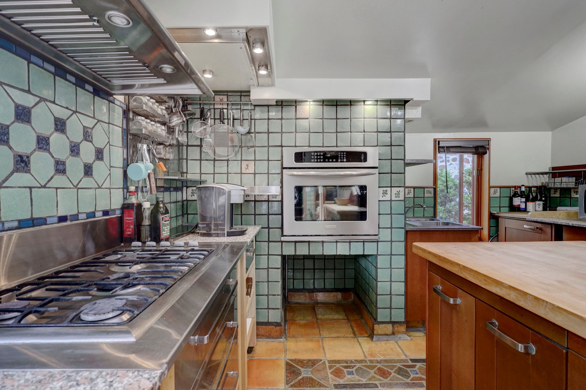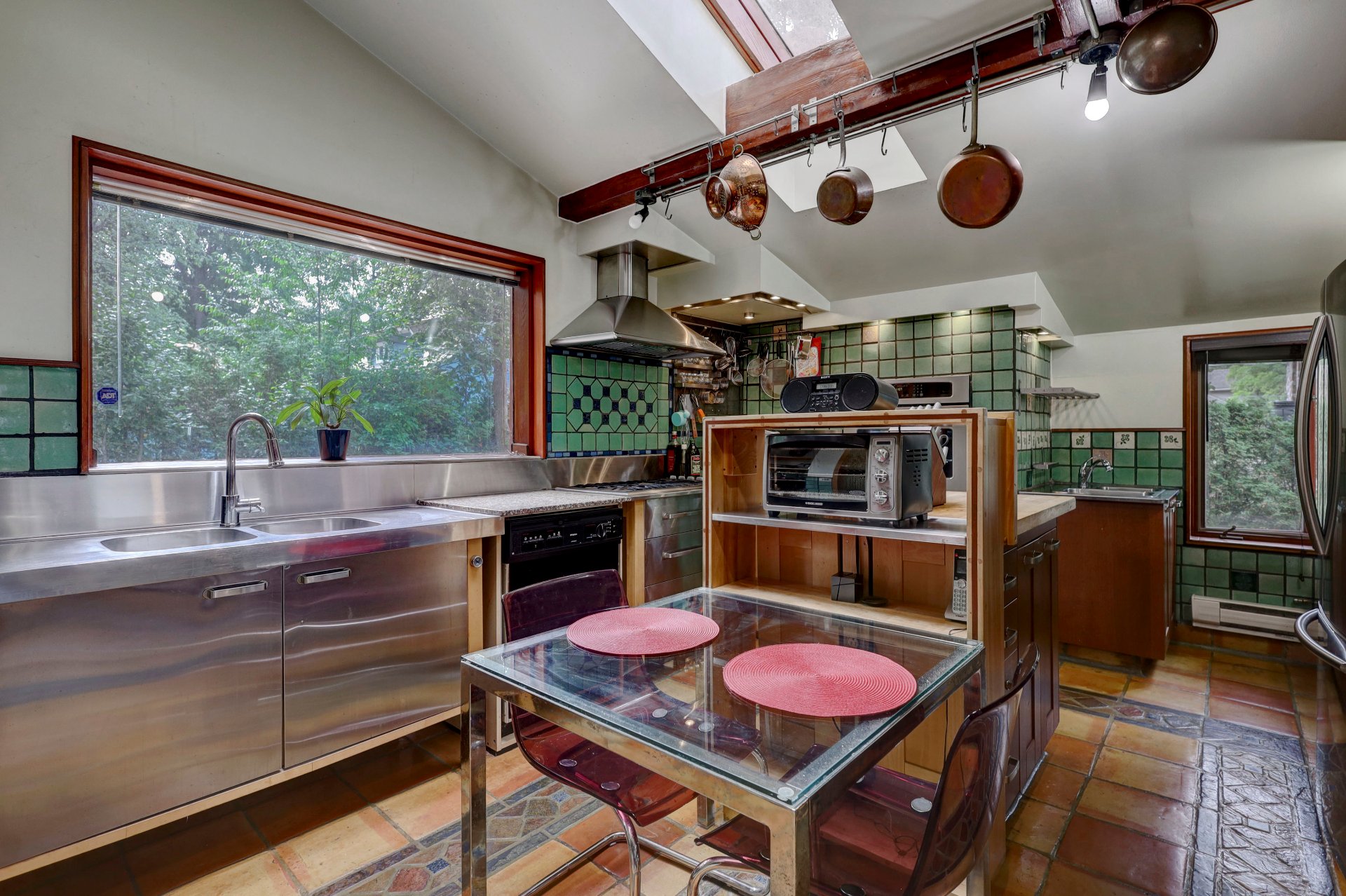 La cuisine fonctionnelle dispose de plafonds voûtés, de comptoirs en granit, d'une cuisinière à gaz, d'un îlot central avec sièges et d'un plan de travail en bois de boucher intégré.