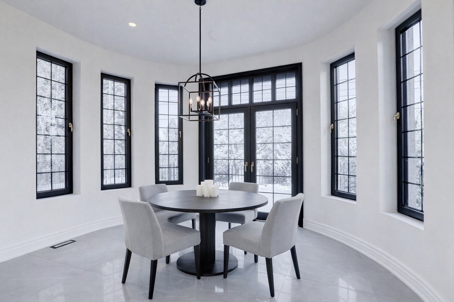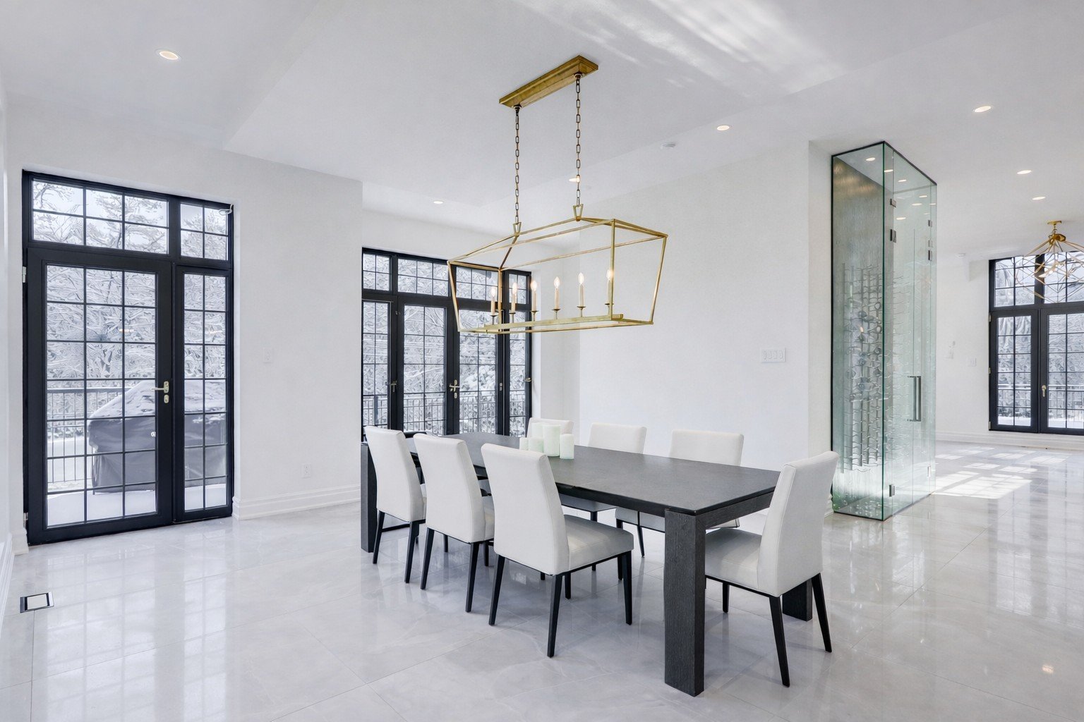 La cuisine donne harmonieusement sur la salle à manger formelle et le coin-repas, chacun muni de portes doubles ouvrant sur des balcons privés.