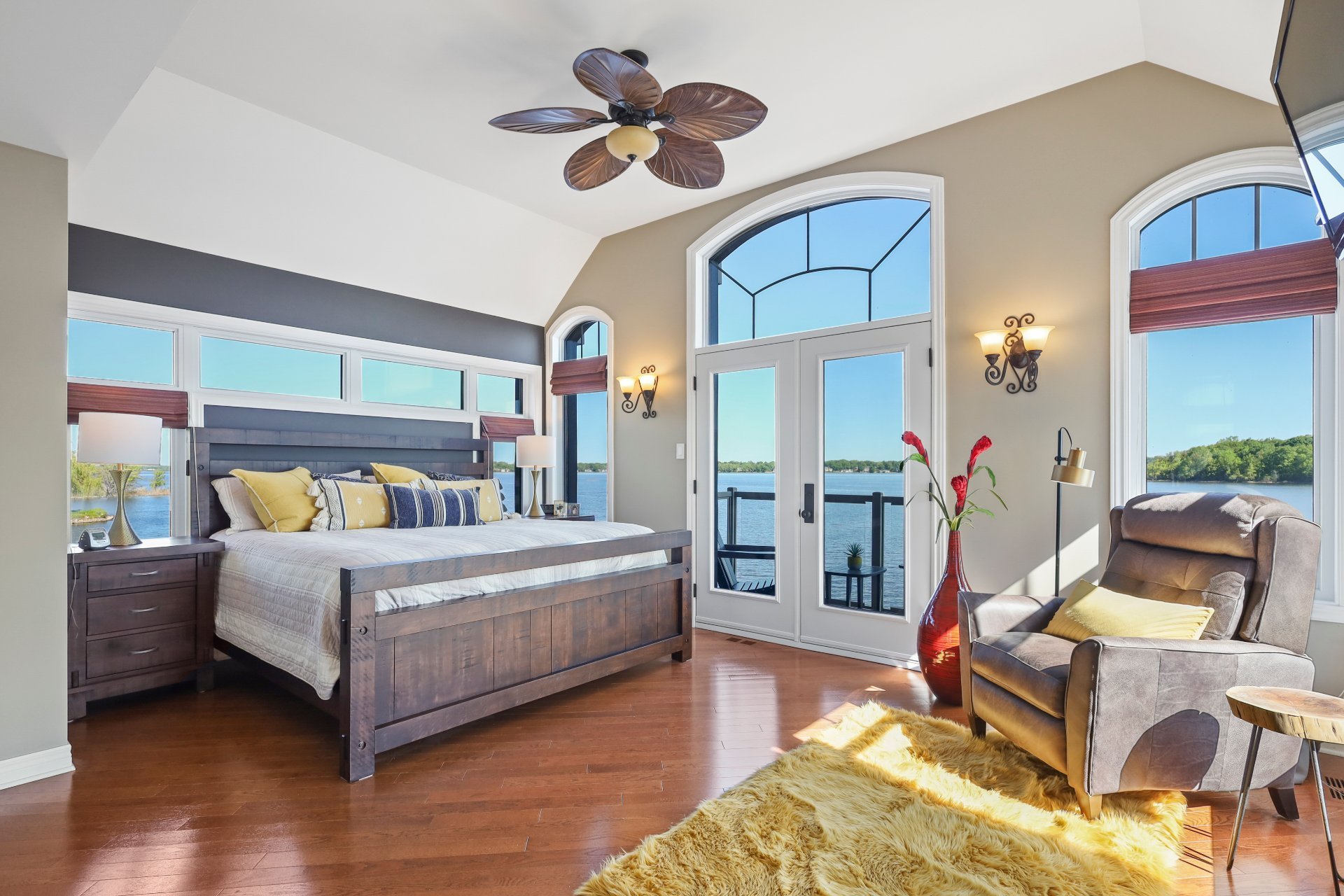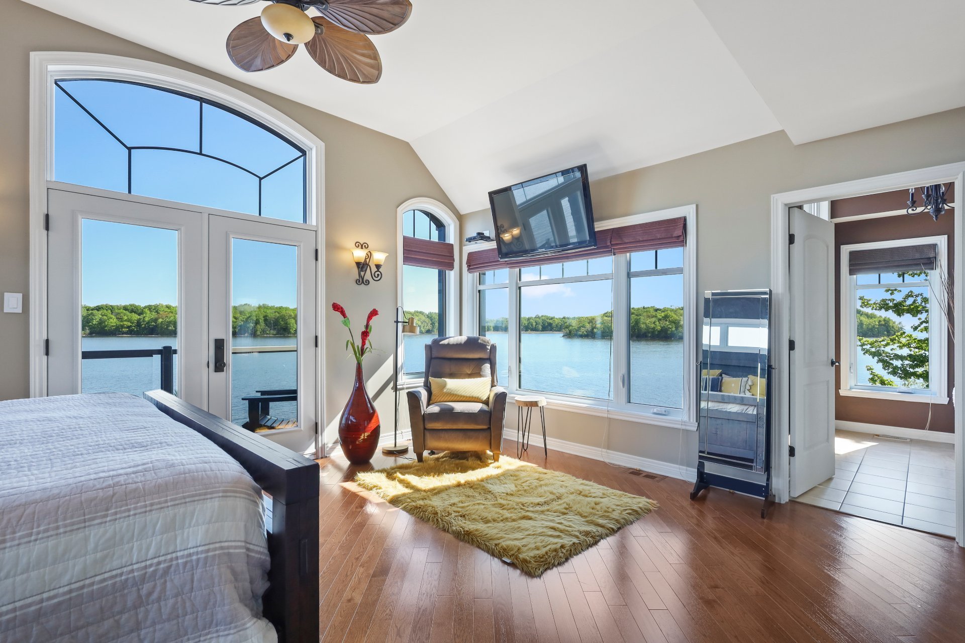 À l'étage, la suite principale style retraite présente des plafonds de 10 pieds, de grandes fenêtres offrant des vues incomparables et un balcon privé donnant sur l'eau. Un spacieux walk-in et une salle de bains attenante, avec une zone de lavage dédiée, complètent cette retraite luxueuse. La deuxième chambre à cet étage comprend également sa propre salle d'eau pour plus d'intimité.
