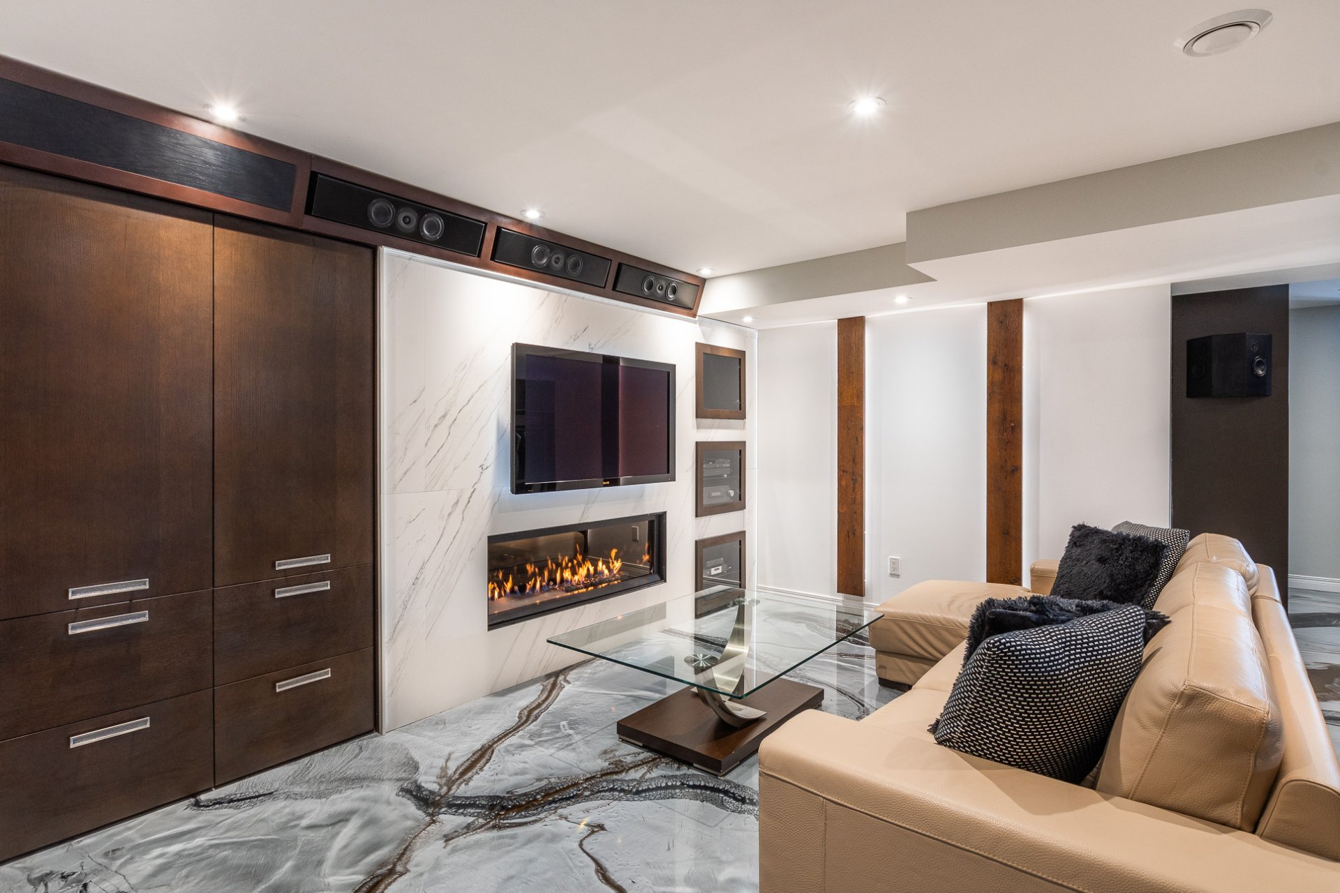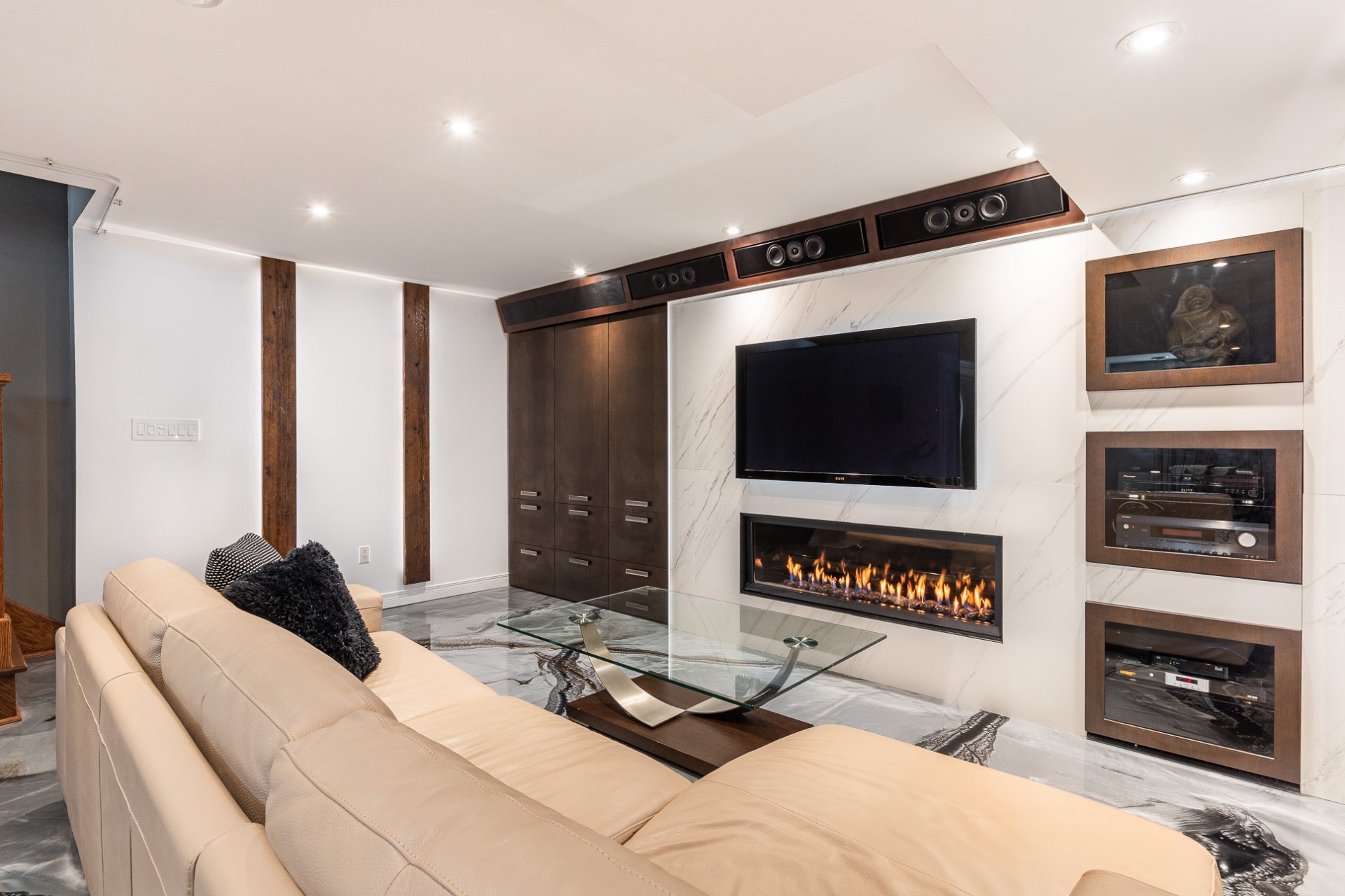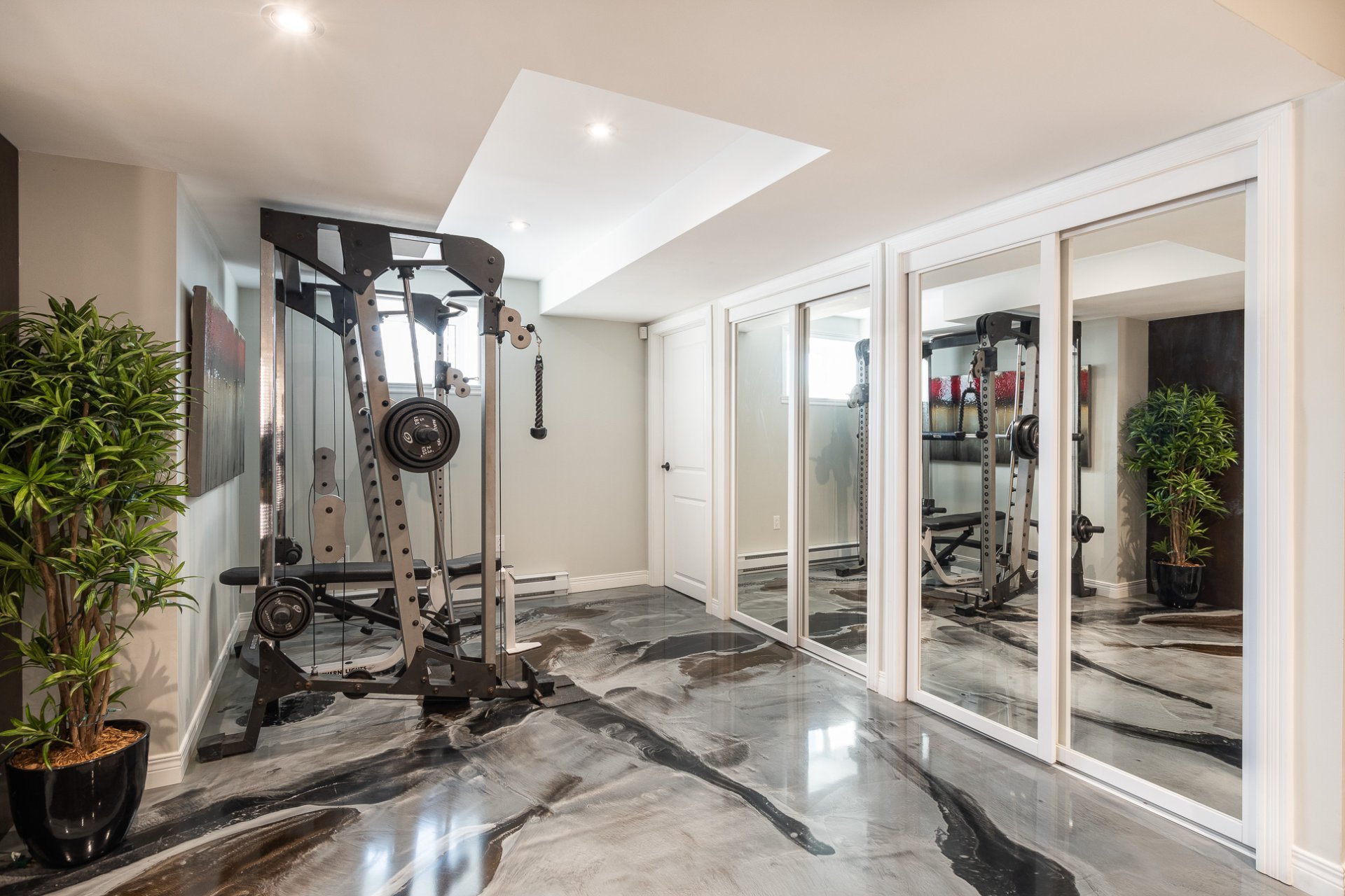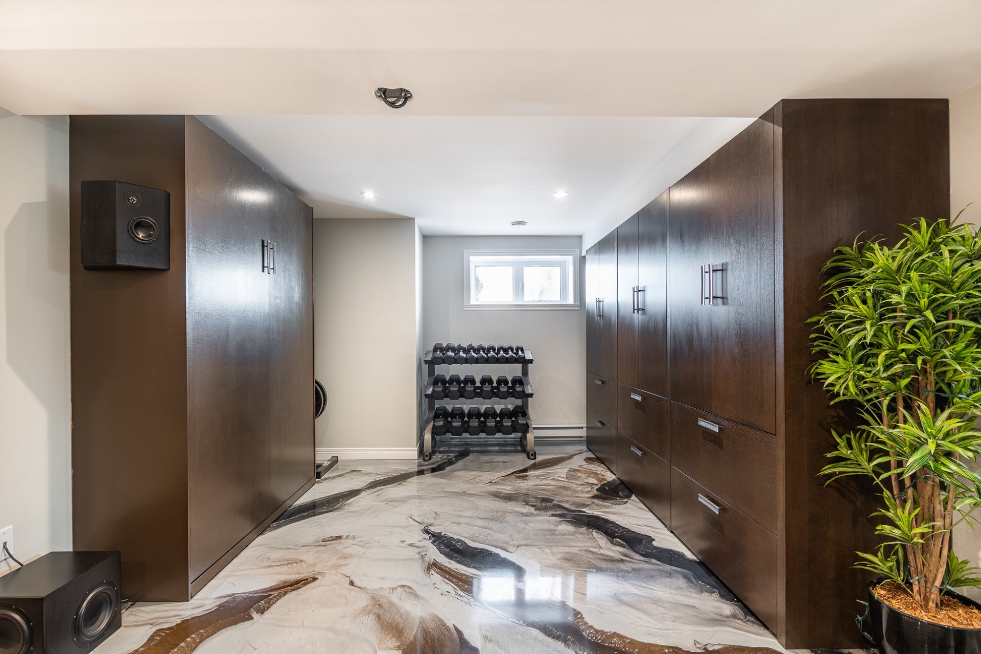 Le sous-sol aménagé offre une salle de jeux avec des meubles intégrés et un troisième foyer, créant un espace de détente agréable. Il y a également un autre espace bureau qui pourrait facilement être converti en une quatrième chambre, ainsi qu'une salle de sport.