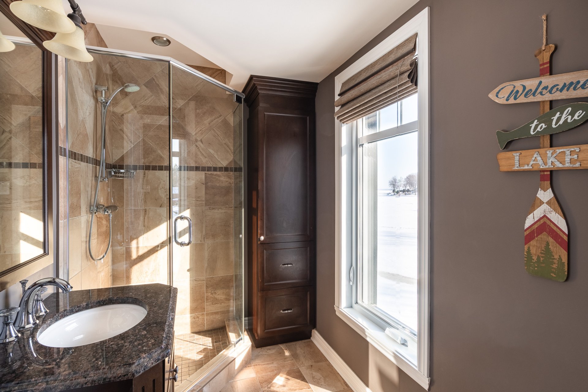 Conçue avec minutie pour capturer la beauté de son environnement, la maison présente un aménagement à aire ouverte maximisant la lumière naturelle et des vues spectaculaires depuis toutes les pièces principales du rez-de-chaussée. Le salon est entouré de fenêtres et de portes-patio menant à une vaste terrasse, idéale pour profiter du paysage. Une cheminée au gaz apporte de la chaleur pour les journées et soirées d'hiver.