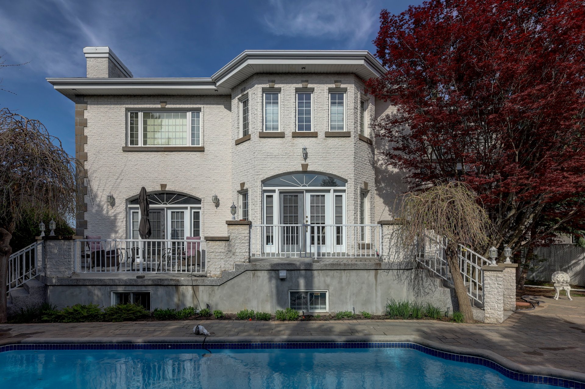 La cour arrière orientée à l'ouest est idéale pour les réceptions en plein air, avec une piscine creusée chauffée à l'eau salée, des zones pavées et un spacieux balcon. Cette maison allie parfaitement luxe, fonctionnalité et confort, en faisant une véritable oeuvre d'art.