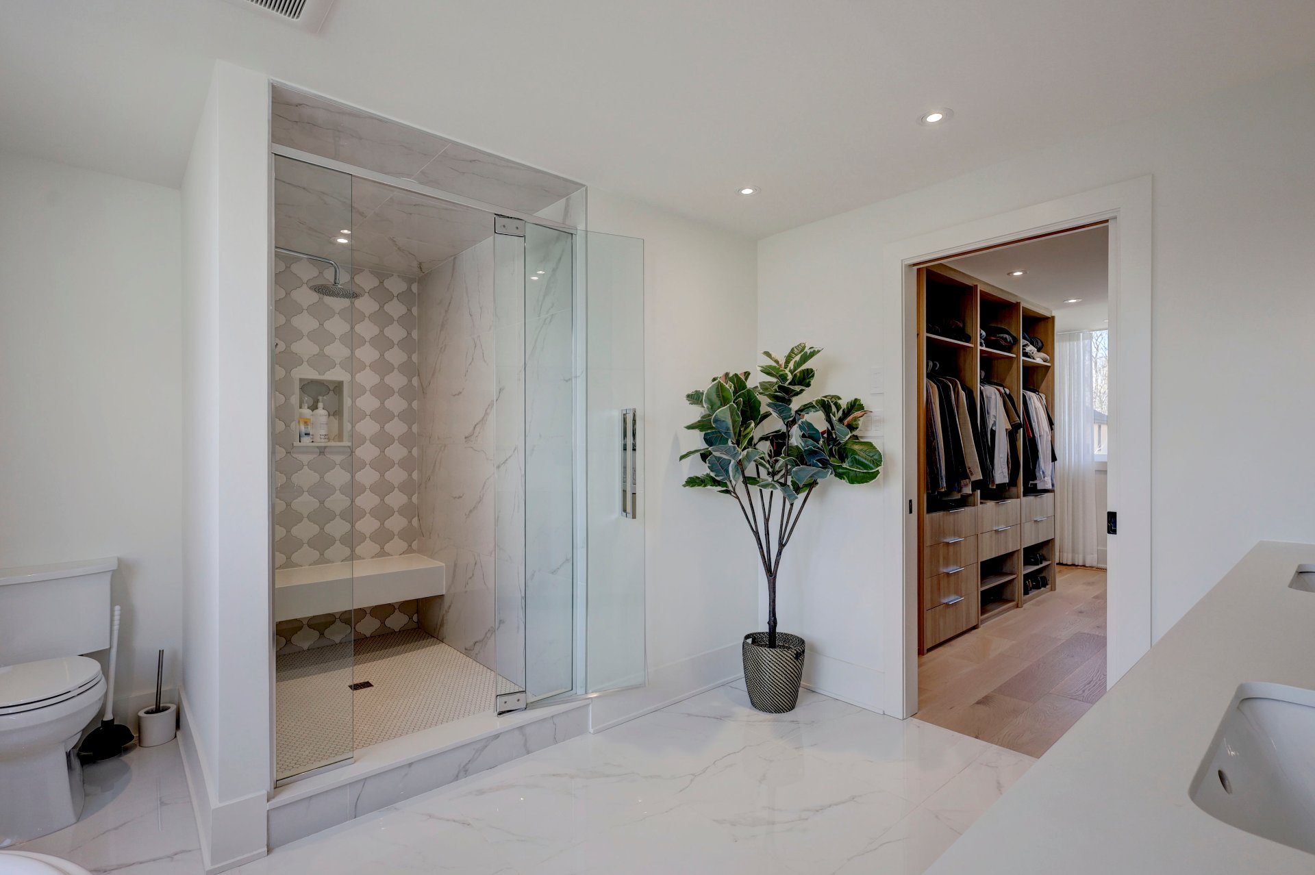 At the heart of the home, the gourmet kitchen features a large center island, quartz countertops and backsplash, a pot filler, and a discreet entry to a spacious 5.9 x 9.9 butler's pantry. The kitchen opens seamlessly to the dinette and elegant living room, where custom built-ins and a gas fireplace create a warm, inviting ambiance.