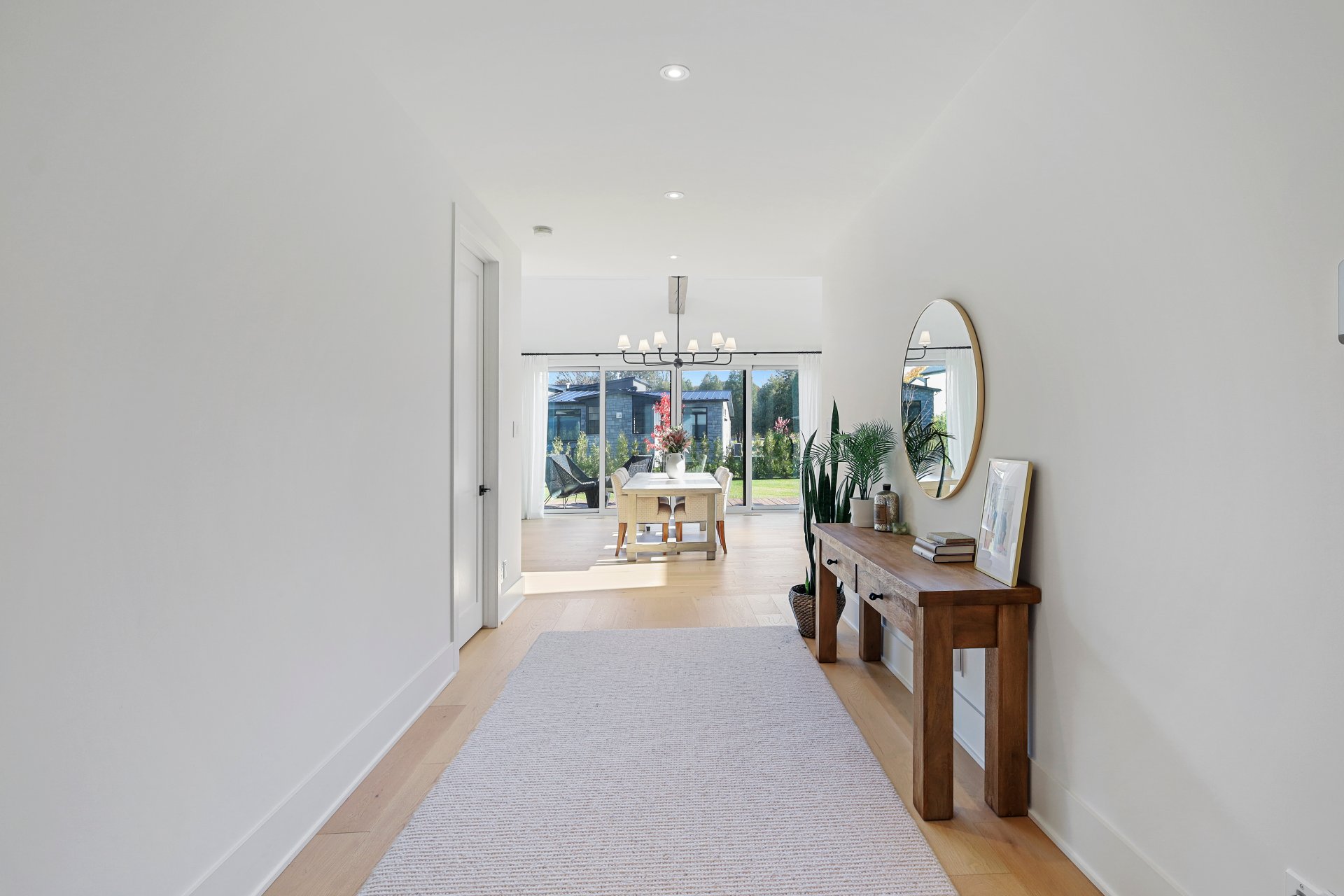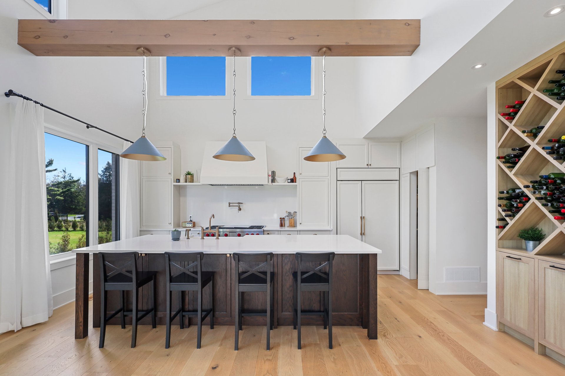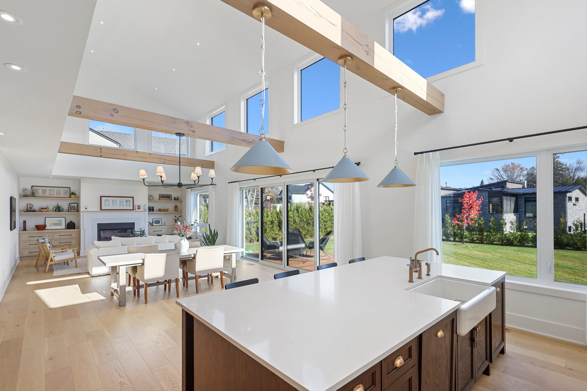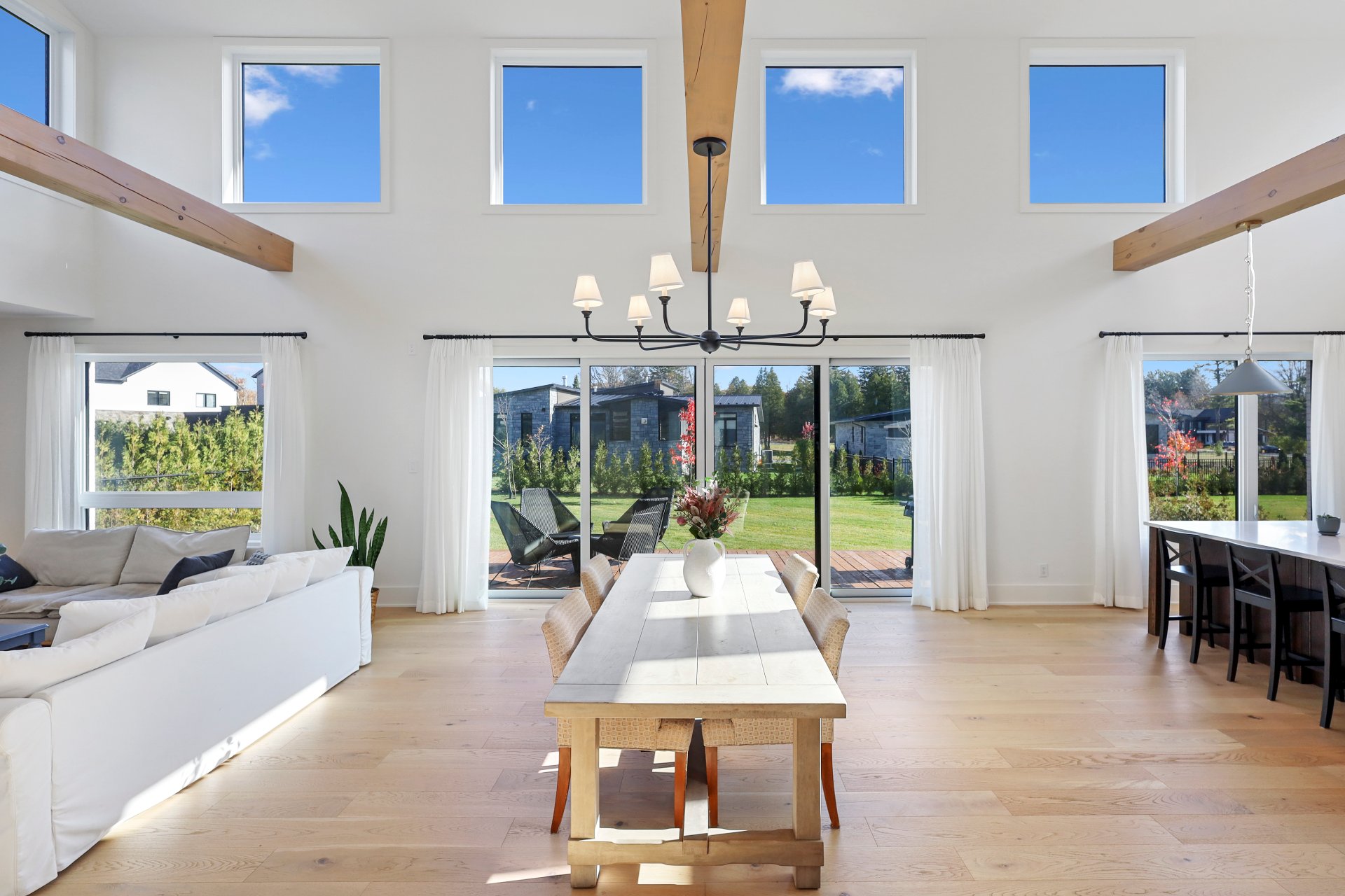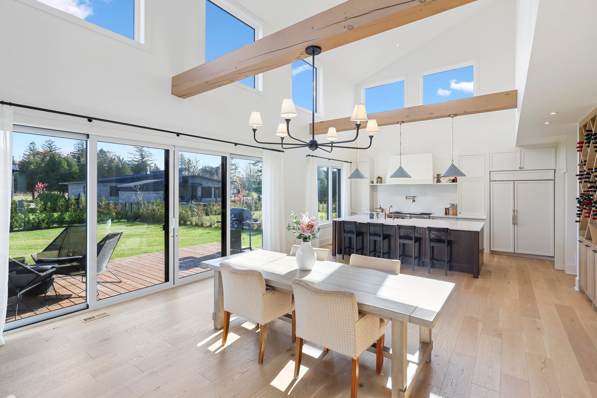 A grand formal vestibule with slate floors sets the tone, leading into an airy, light-filled home designed for both comfort and entertaining. The rear of the home showcases free-flowing living spaces with soaring ceilings and expansive windows.
