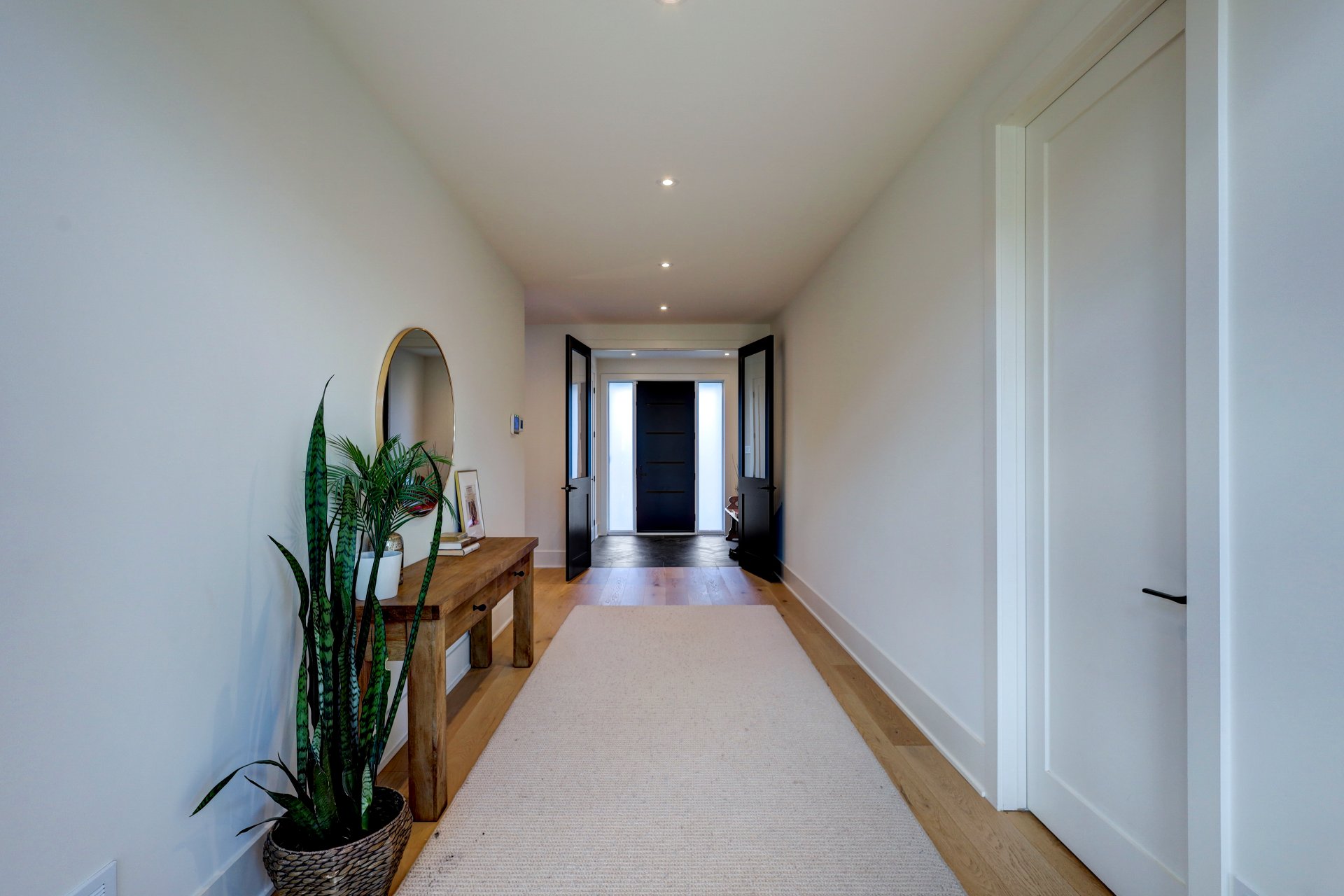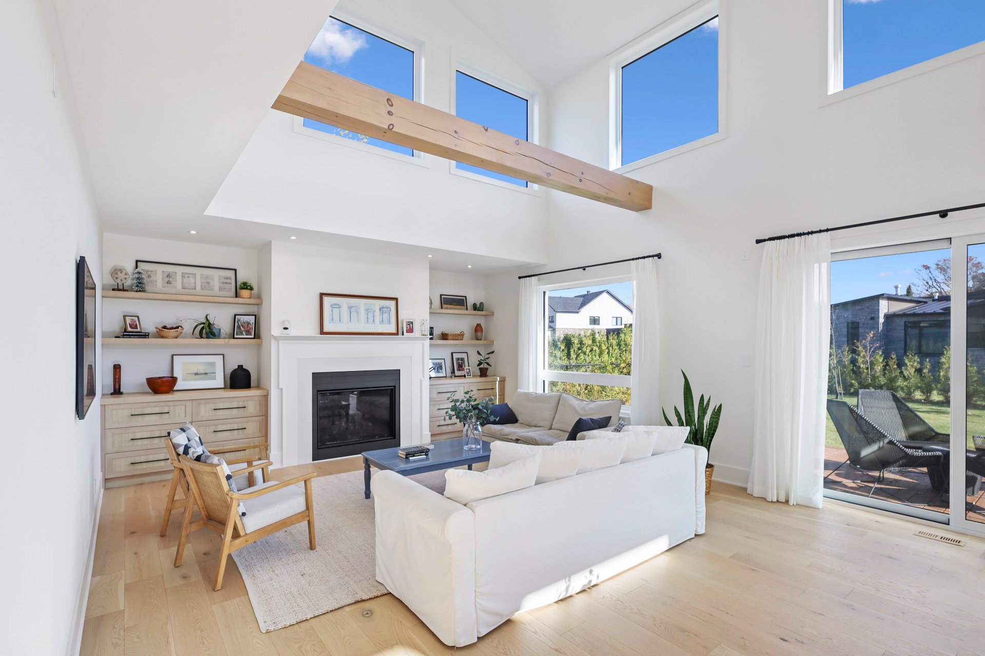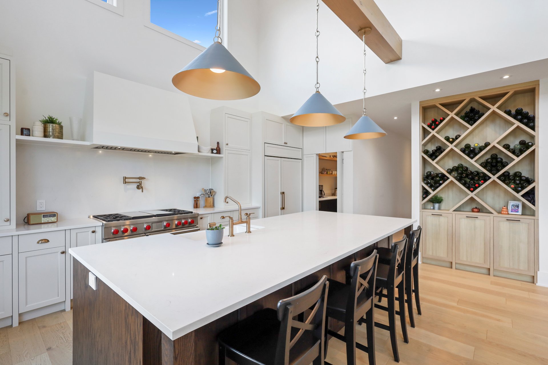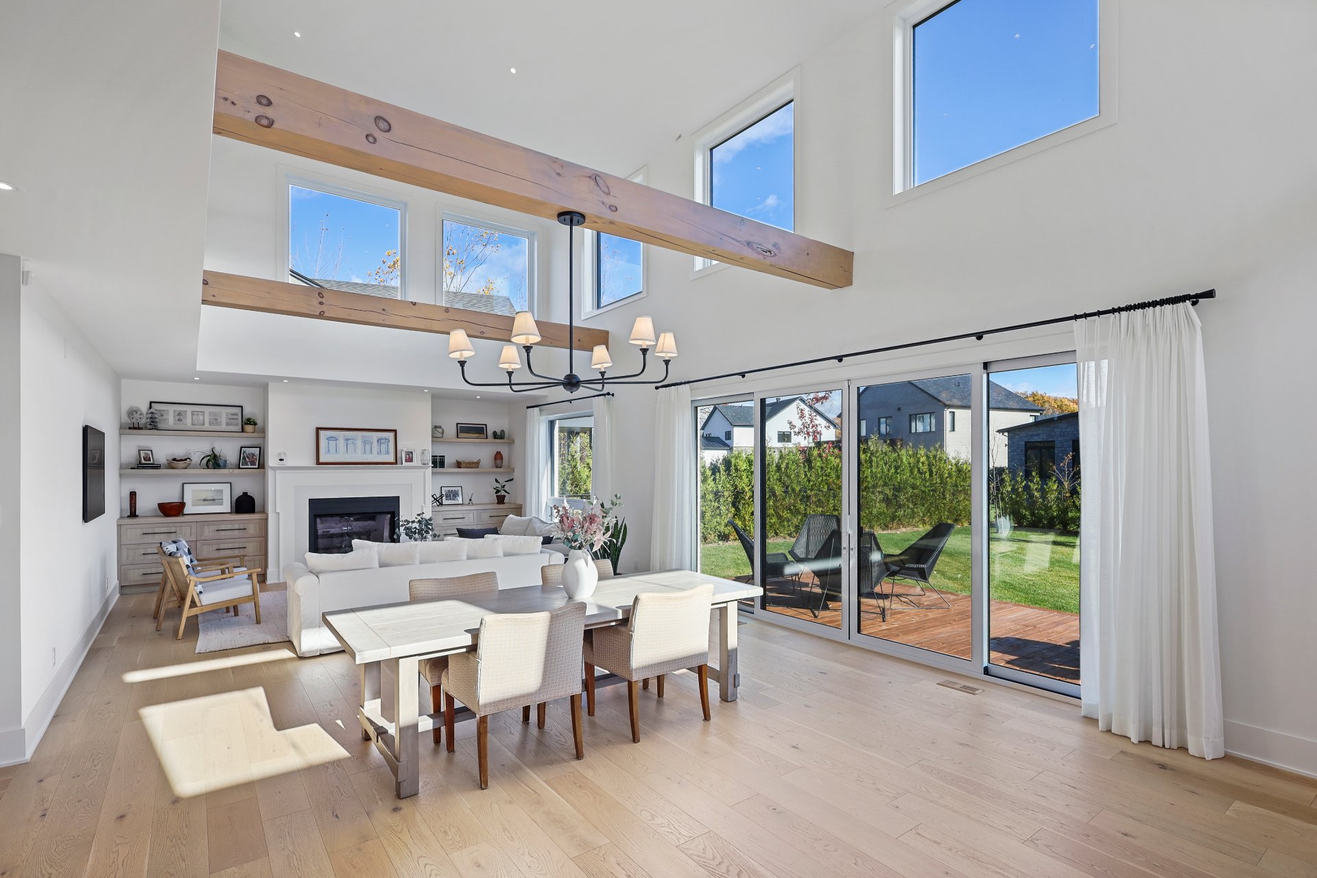 A grand formal vestibule with slate floors sets the tone, leading into an airy, light-filled home designed for both comfort and entertaining. The rear of the home showcases free-flowing living spaces with soaring ceilings and expansive windows.
