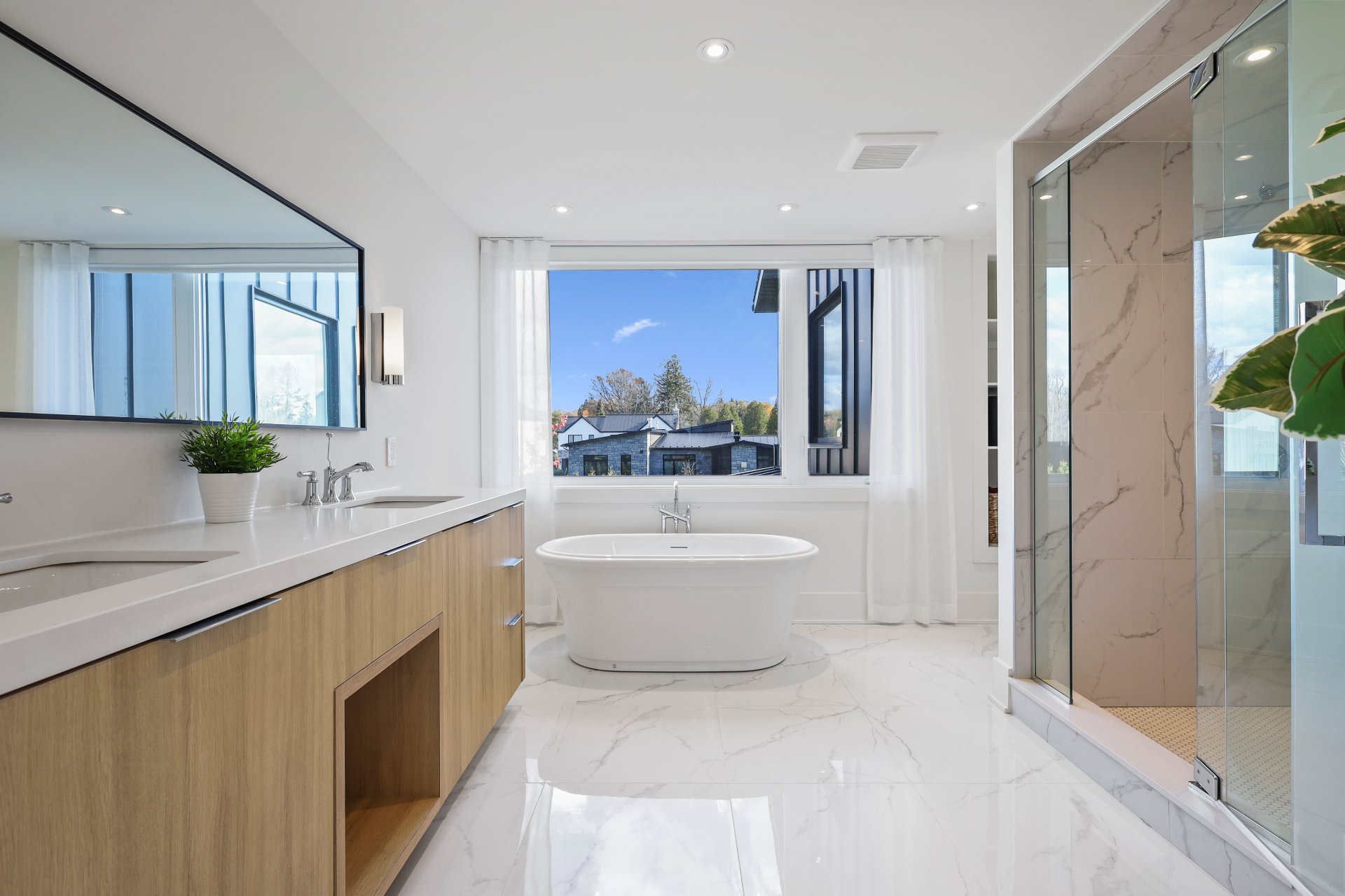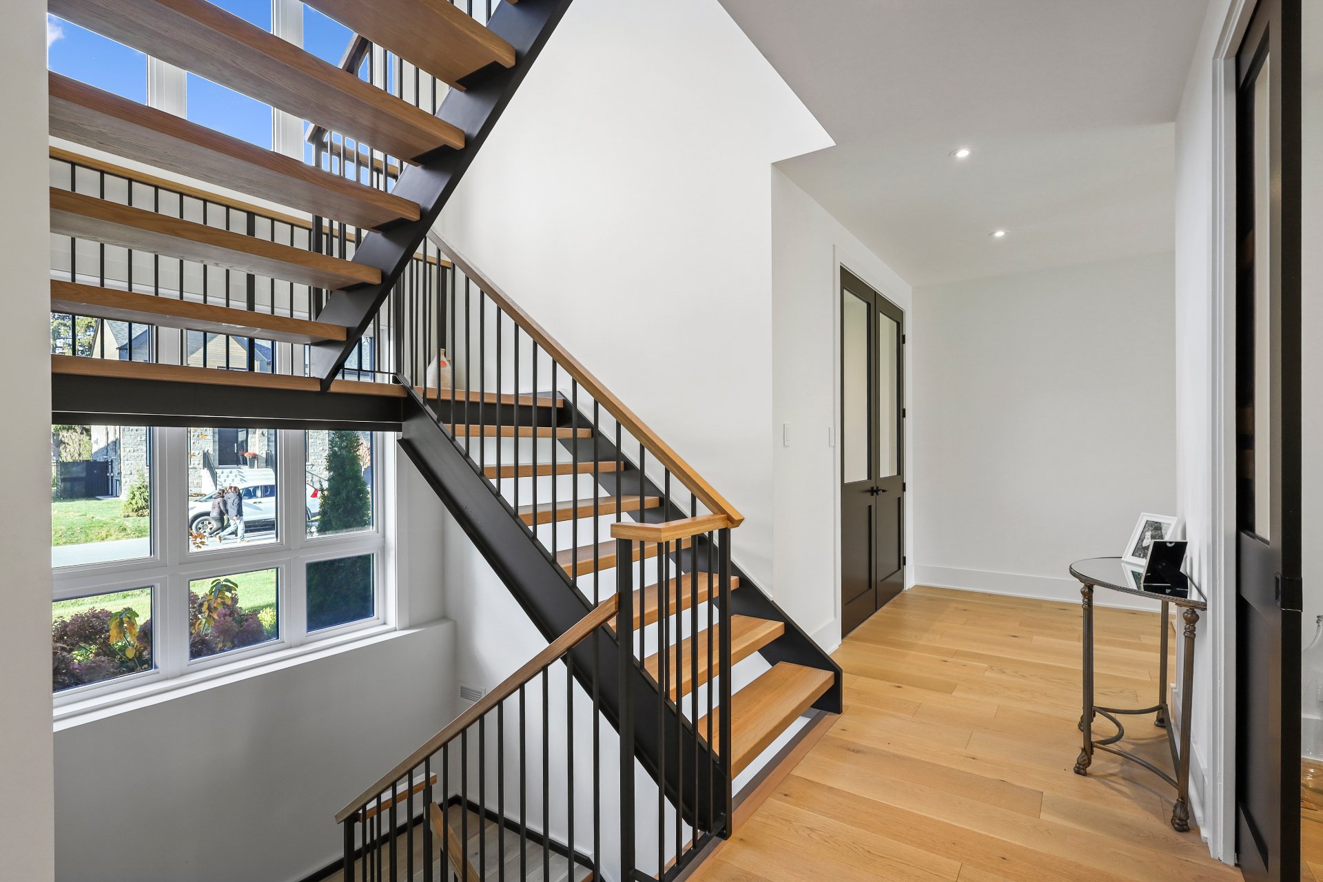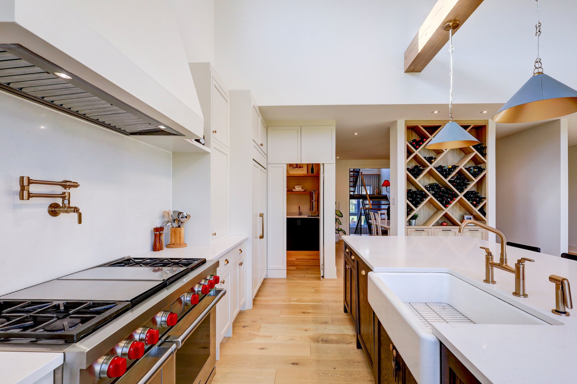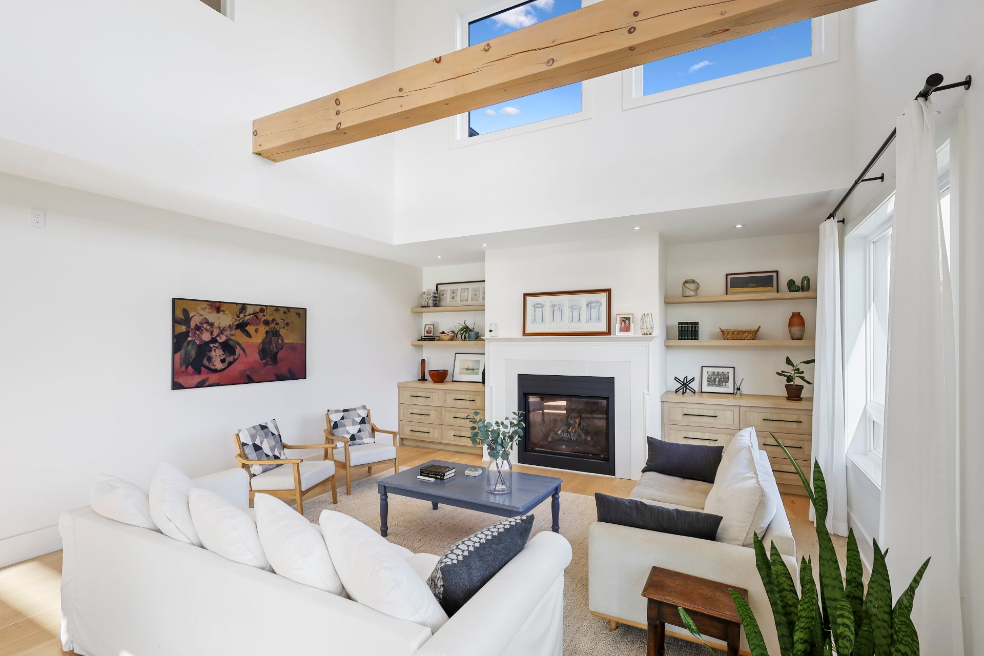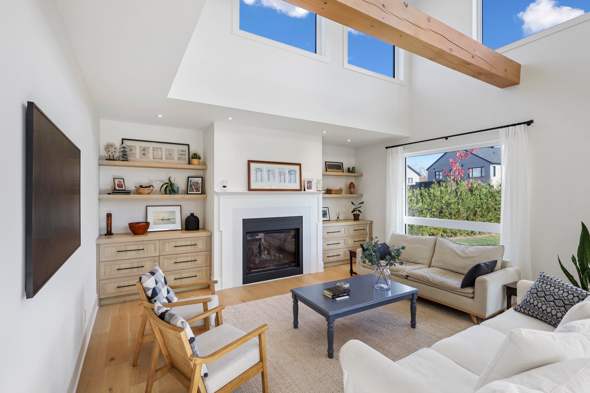 A grand formal vestibule with slate floors sets the tone, leading into an airy, light-filled home designed for both comfort and entertaining. The rear of the home showcases free-flowing living spaces with soaring ceilings and expansive windows.