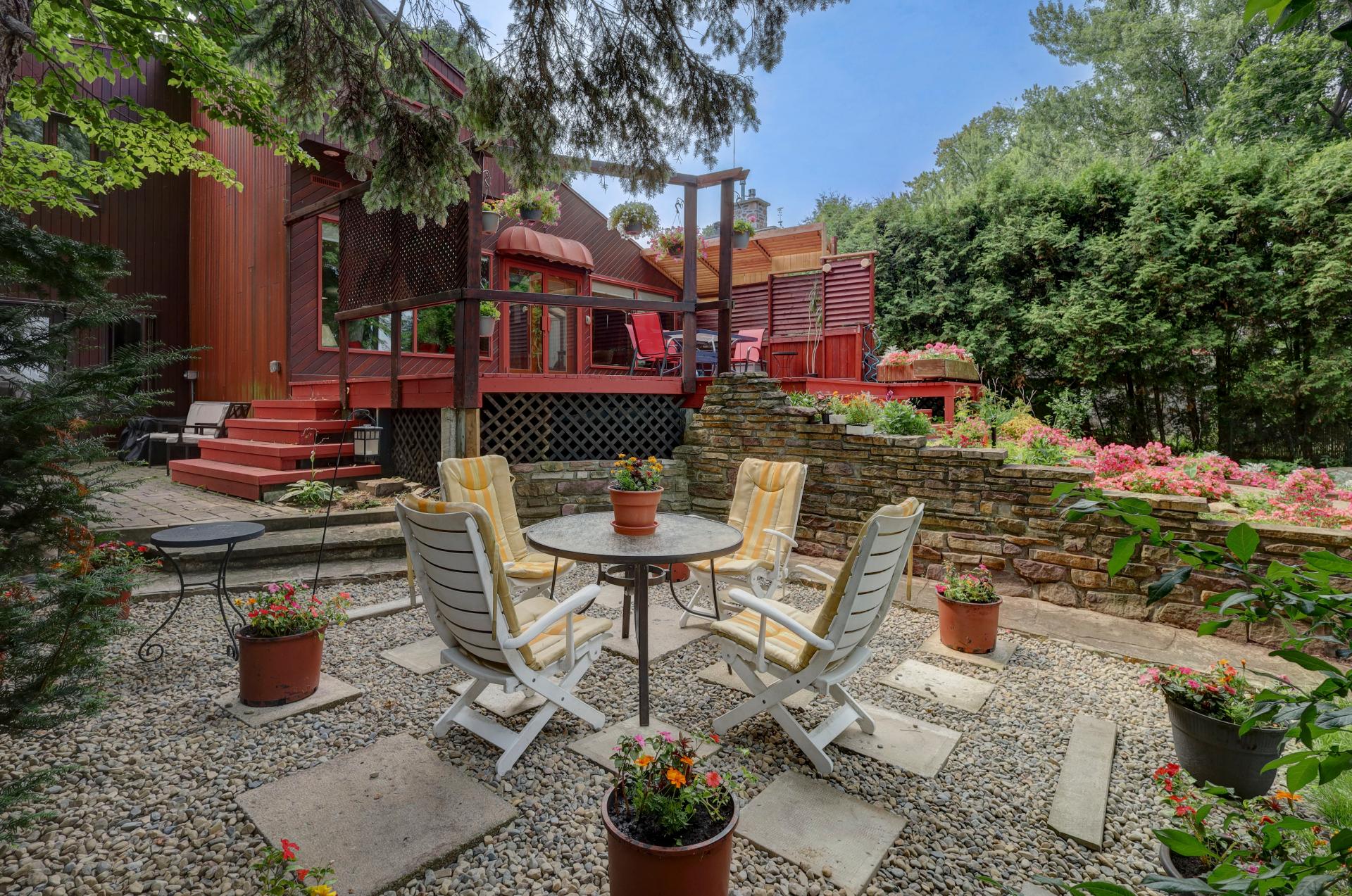 The garden-level entrance leads to two bedrooms and a full bathroom, one bedroom offering direct access to the patio and yard. The upper level is home to two additional bedrooms and a full bathroom. The front bedroom has a private 26'x15' wooded balcony, perfect for enjoying morning coffee or evening sunsets.