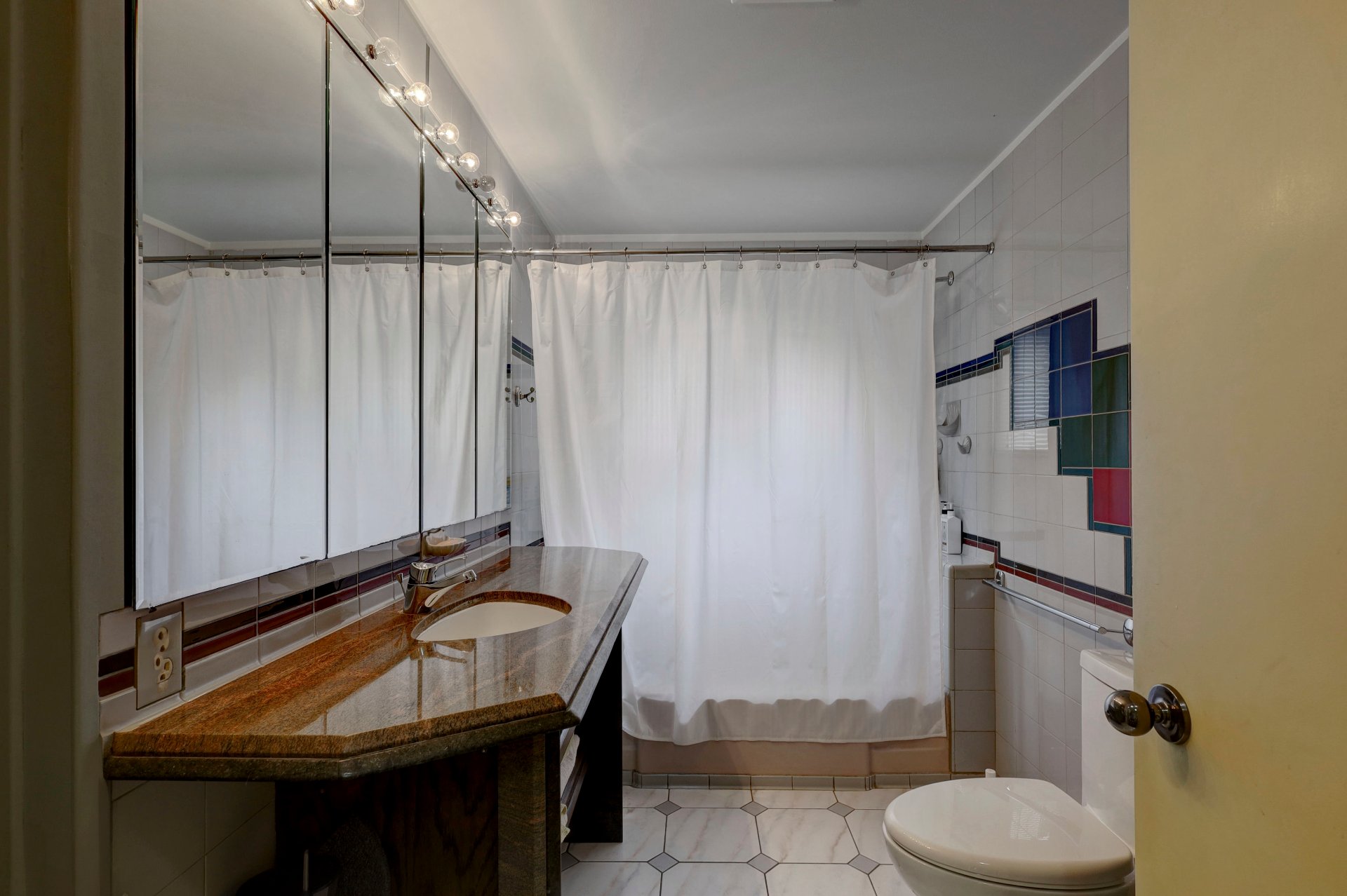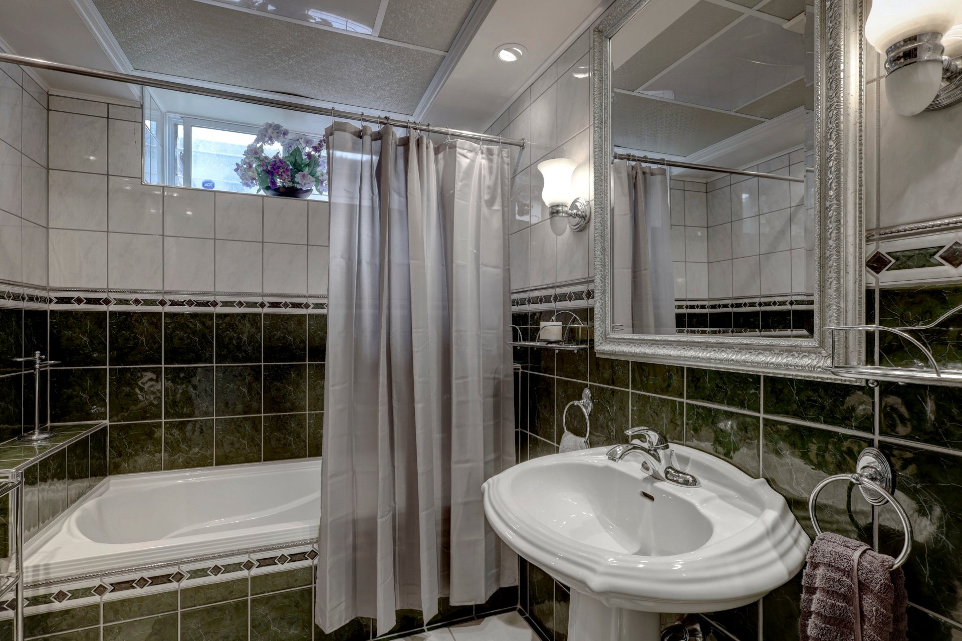 The main floor showcases terracotta floors, custom wooden doors with etched glass, and an open-concept layout with sweeping water views. The spacious living room is enhanced by a gas fireplace and a sunken sitting area (8'11 x 9'10) with hardwood floors. The dining room flows into a solarium, and a cozy den with glass brick walls offers serene views of the outdoors.