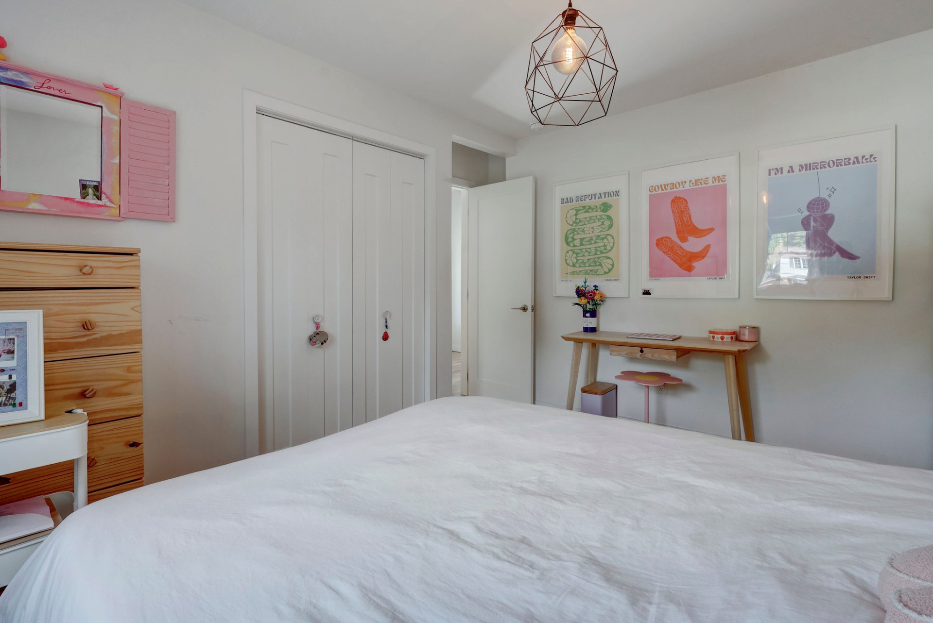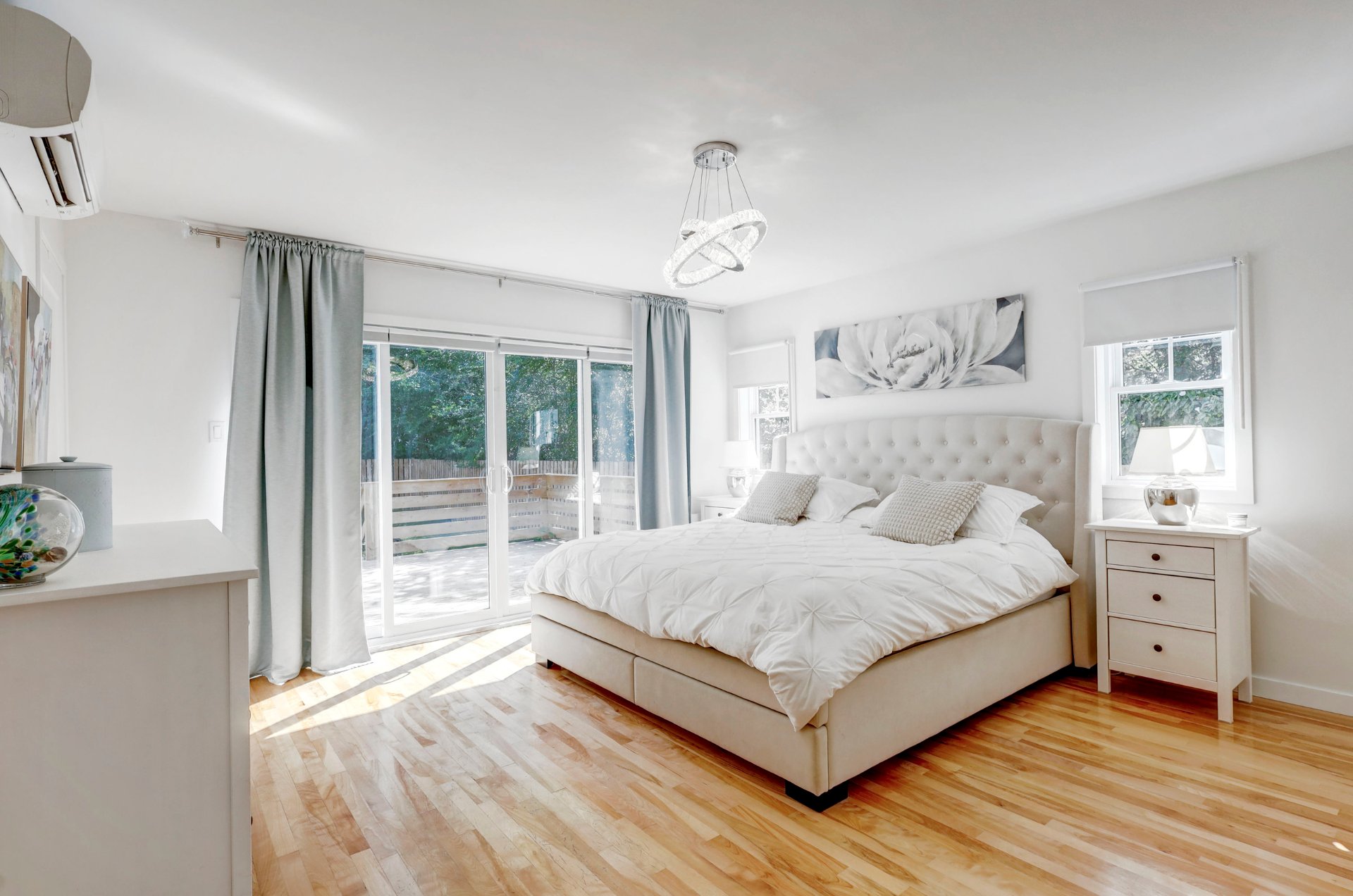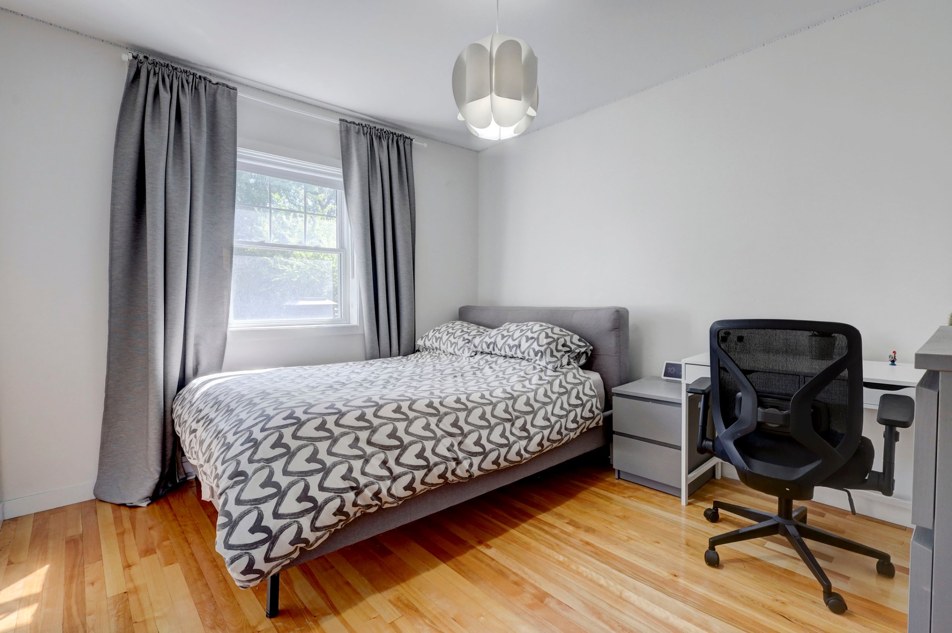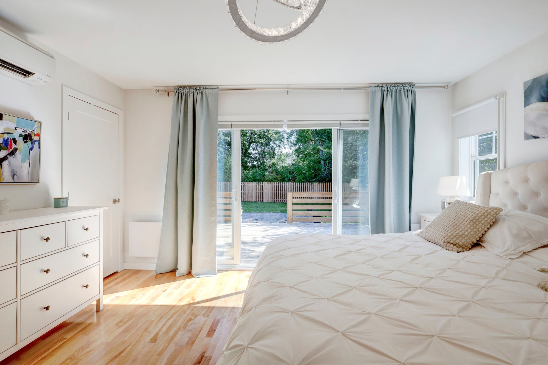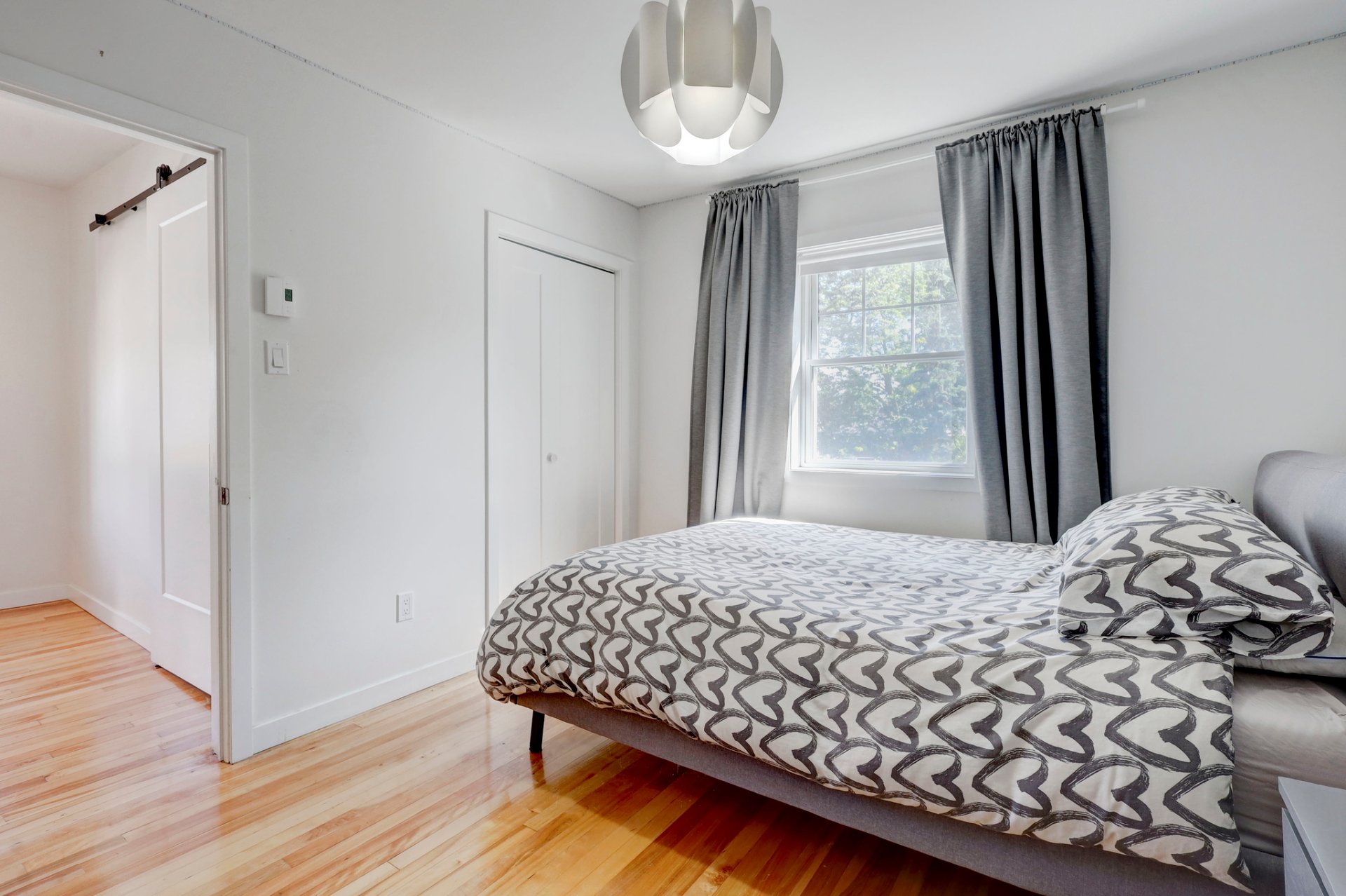 Curtains and main bedroom light fixture