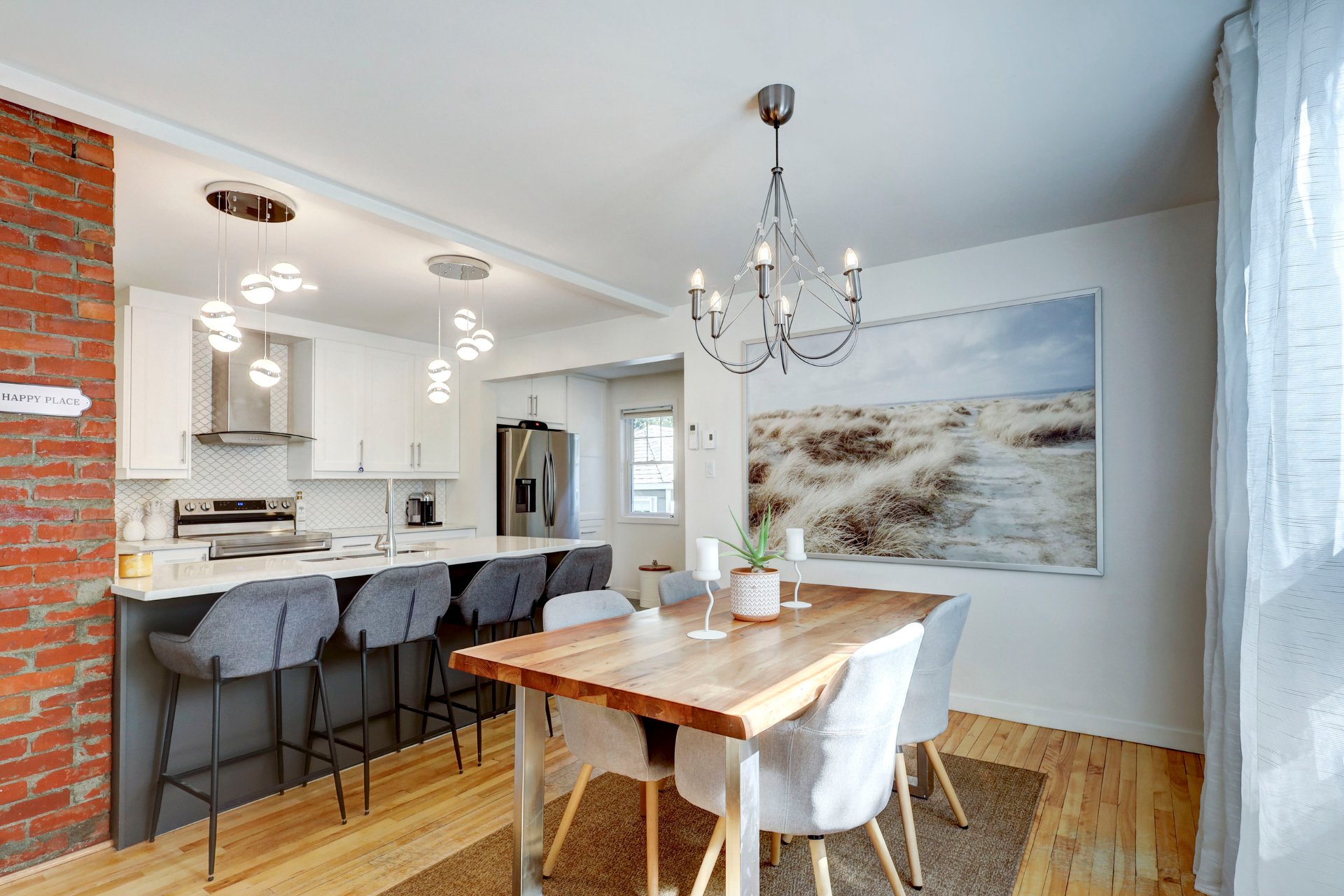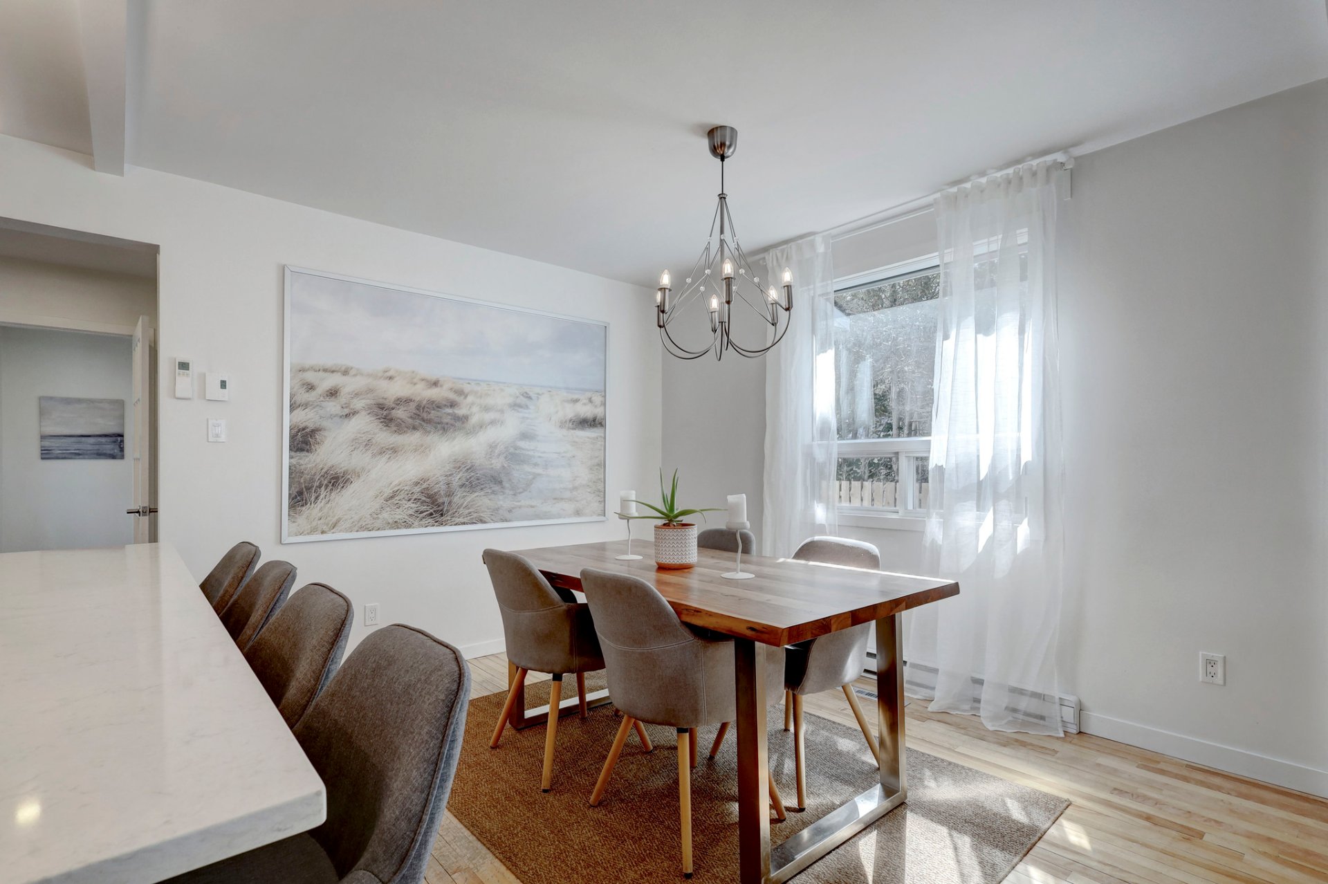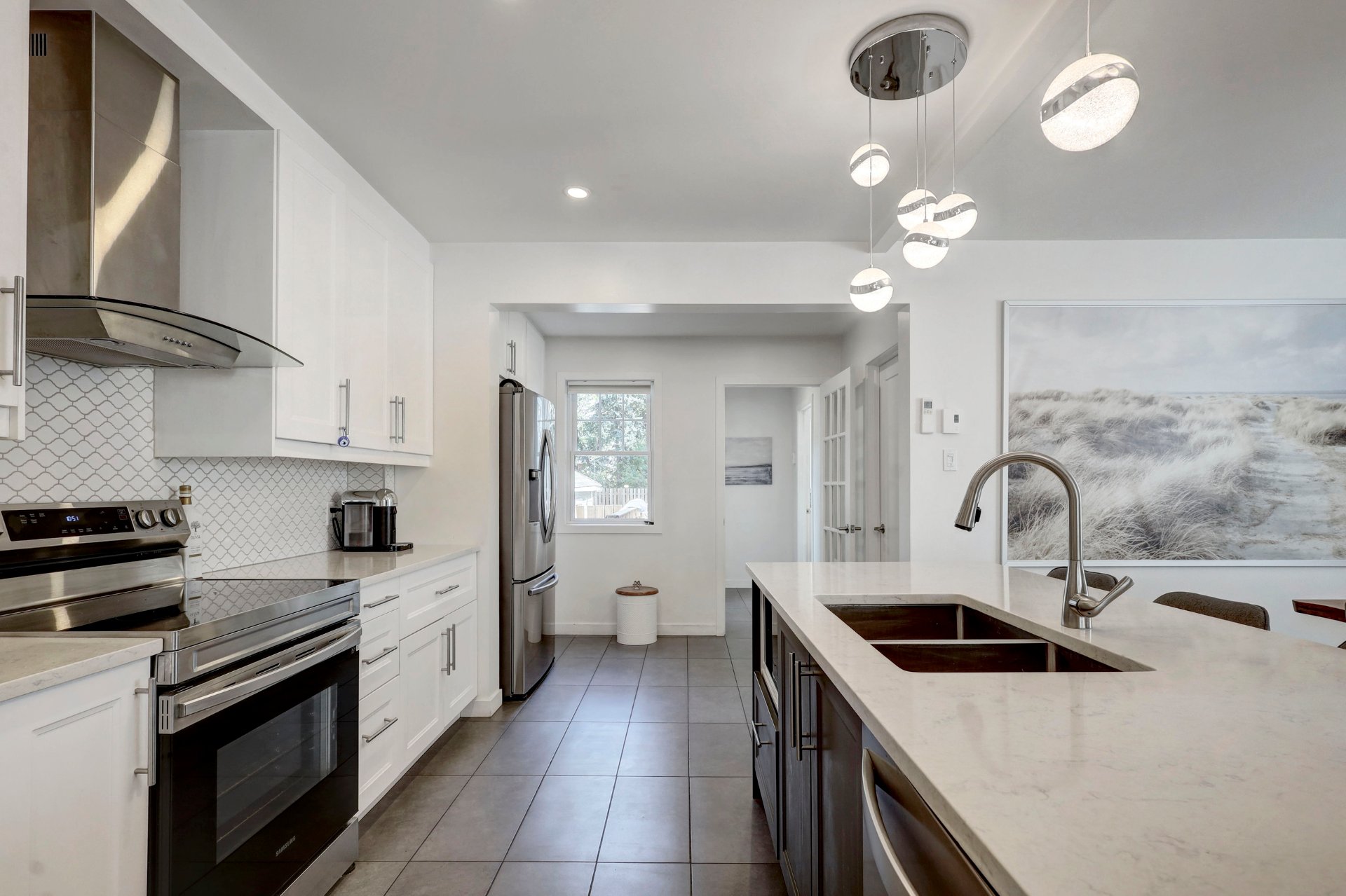 The dining area flows effortlessly into a stunning chef's kitchen, where a large quartz island invites conversation, casual meals, or hosting with ease. With custom cabinetry, ample counter space, and smart storage solutions, the kitchen is as functional as it is beautiful.