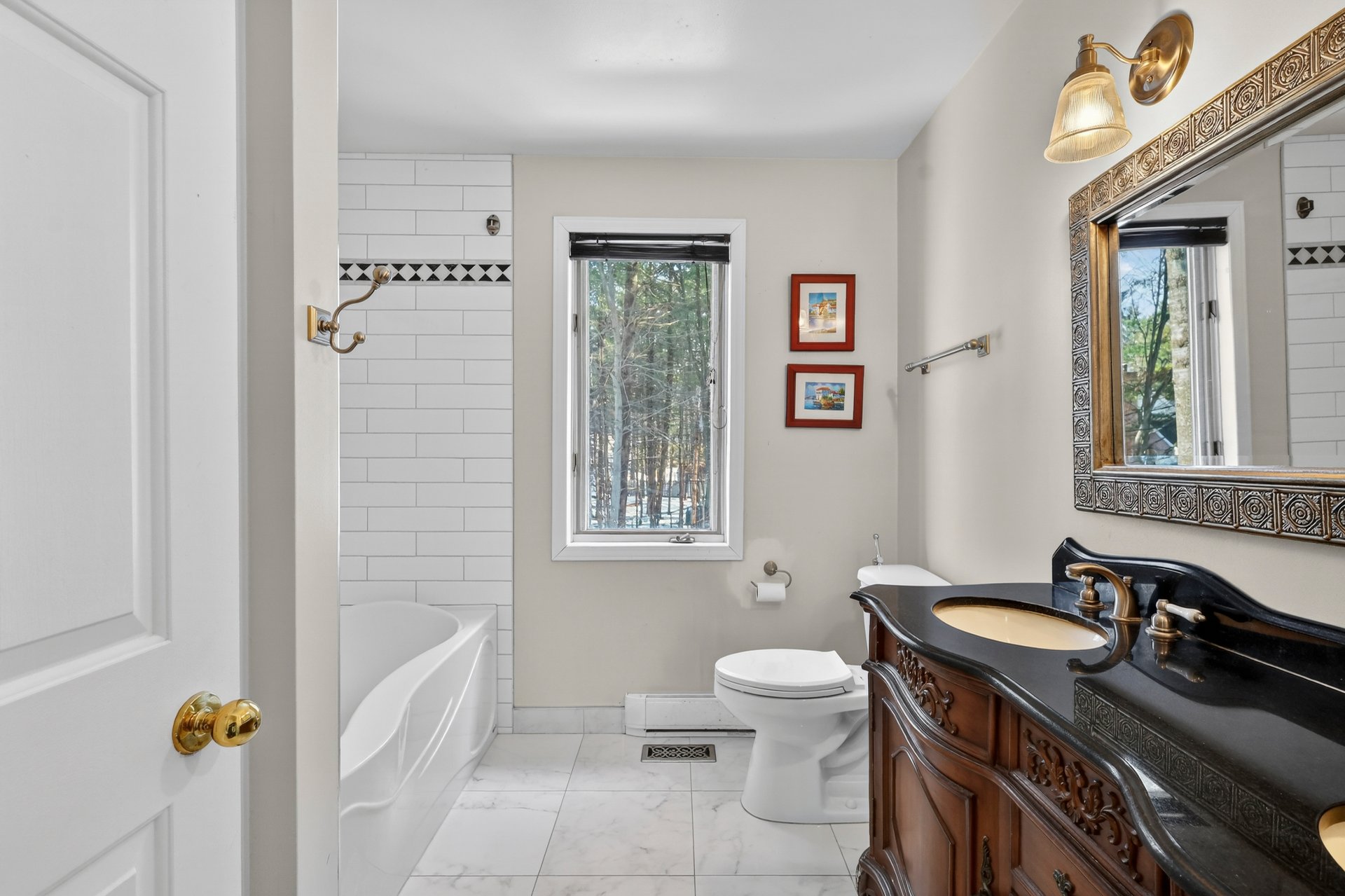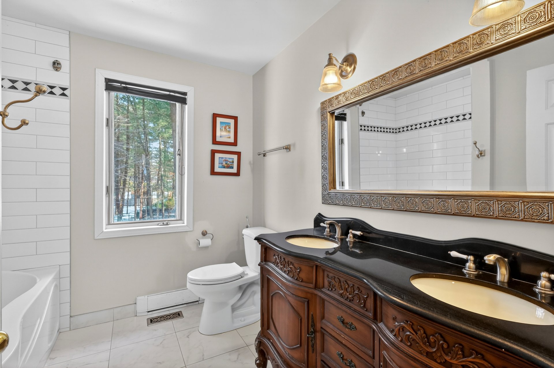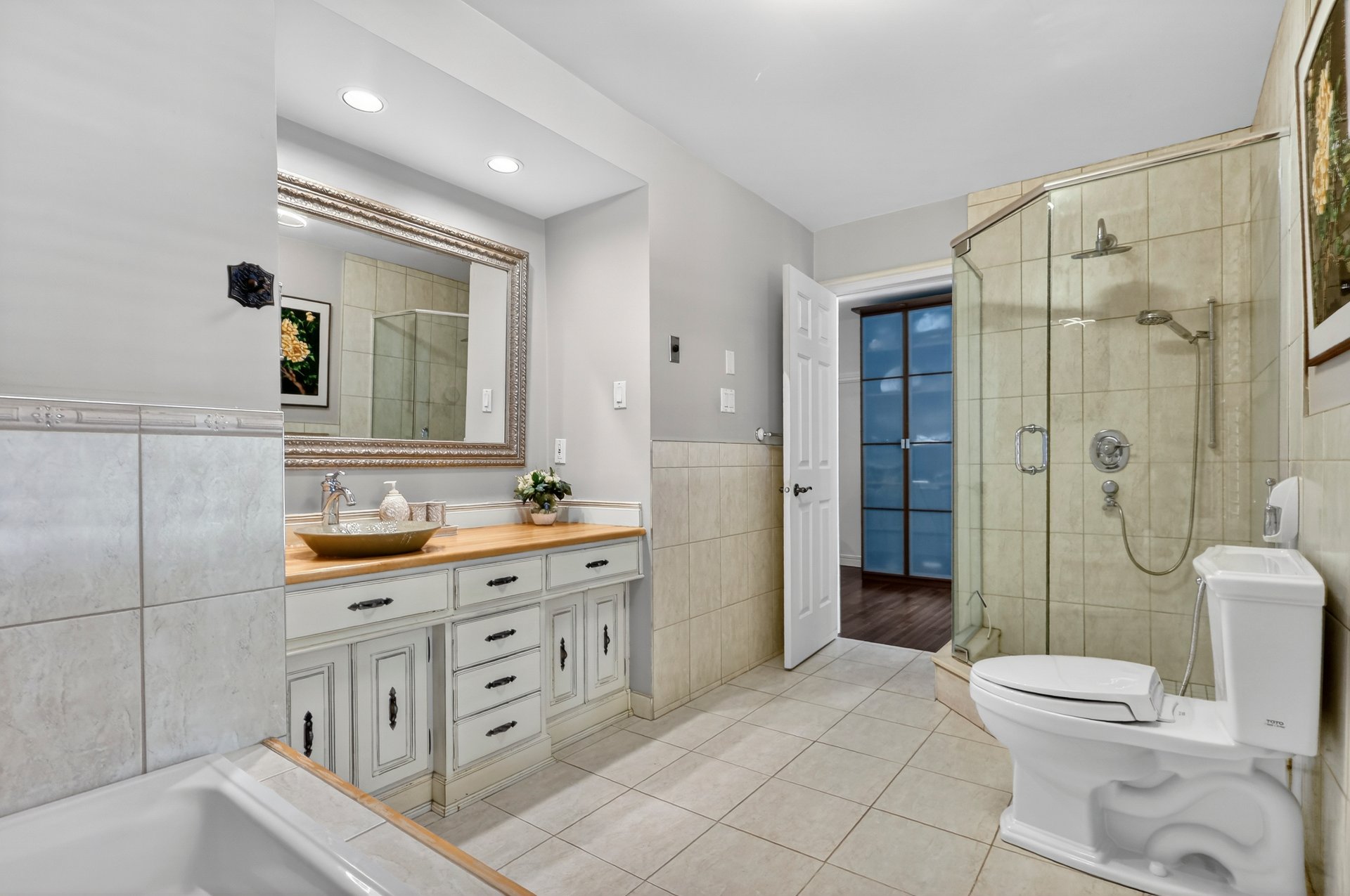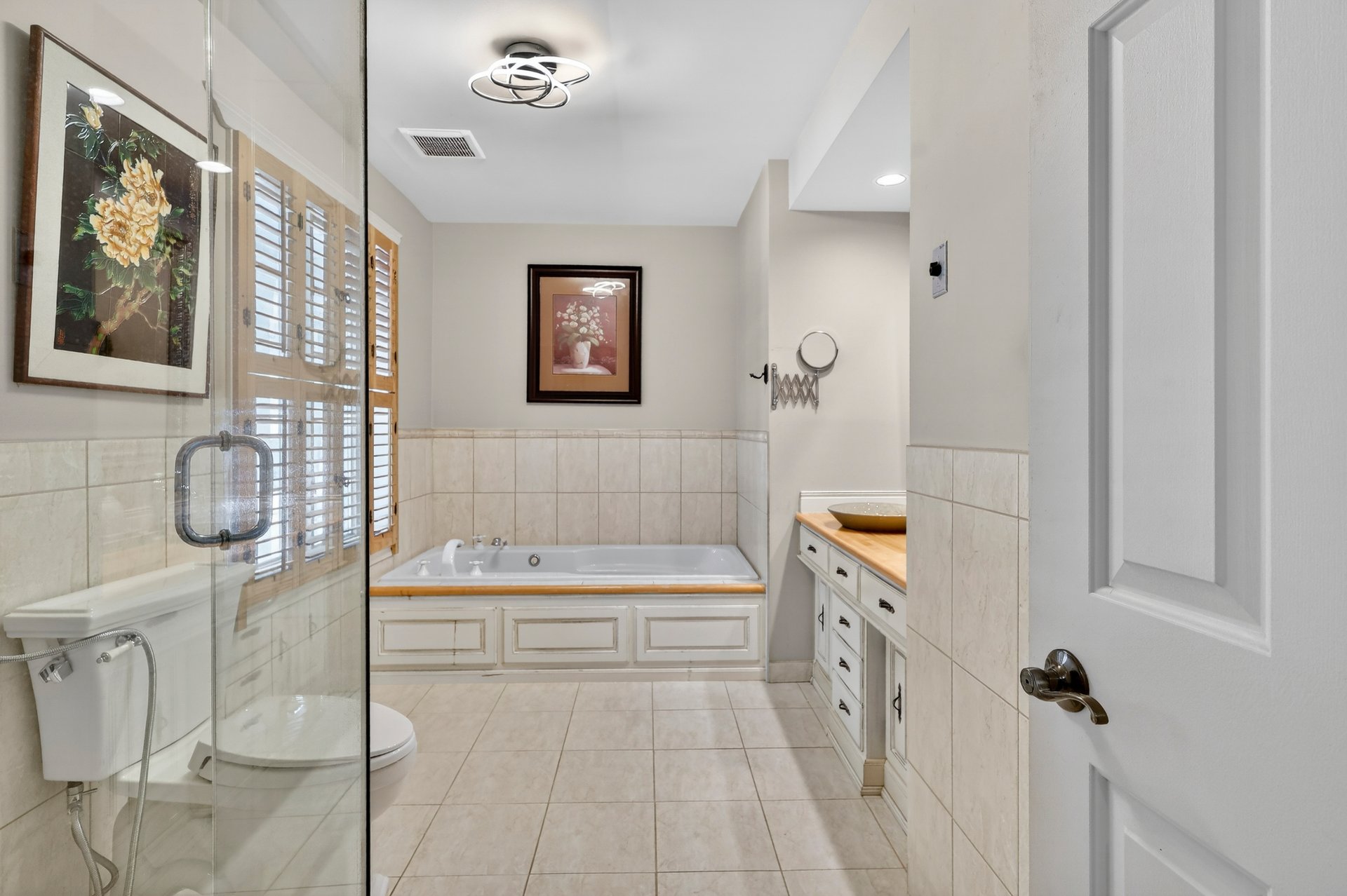 Upstairs, the spacious primary suite offers a private sitting area, walk-in closet, and an ensuite bathroom with a jacuzzi tub and separate shower.