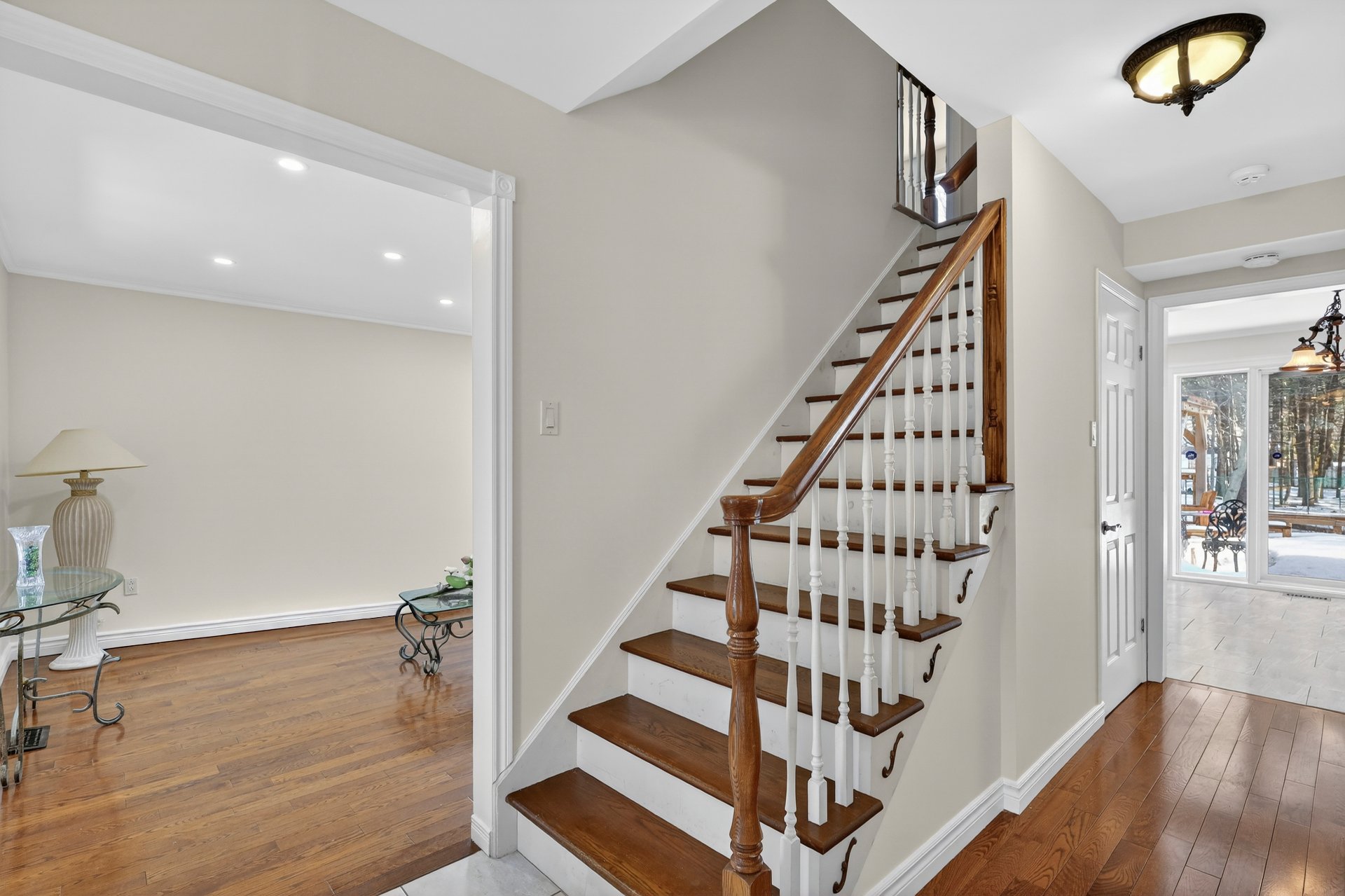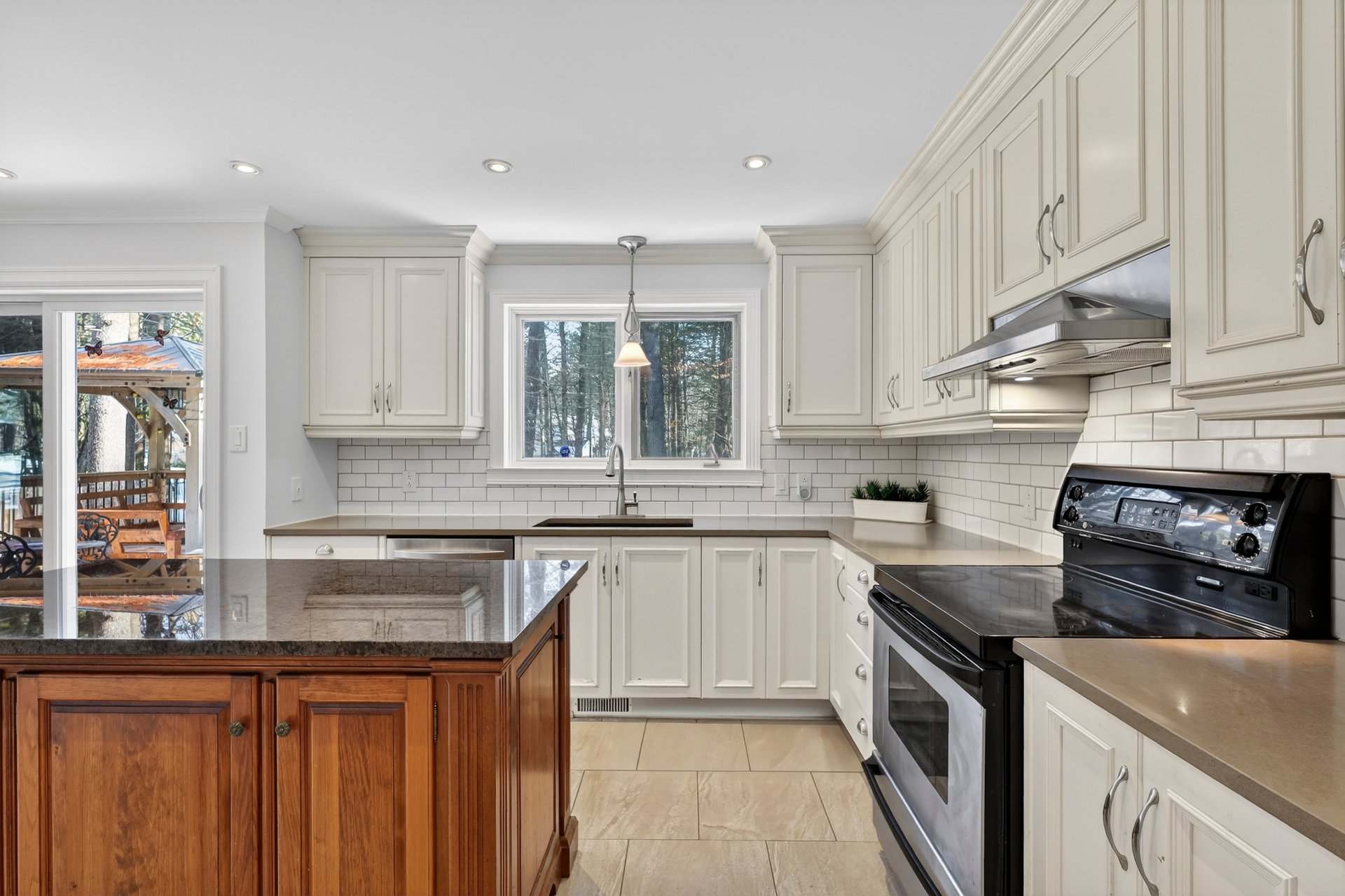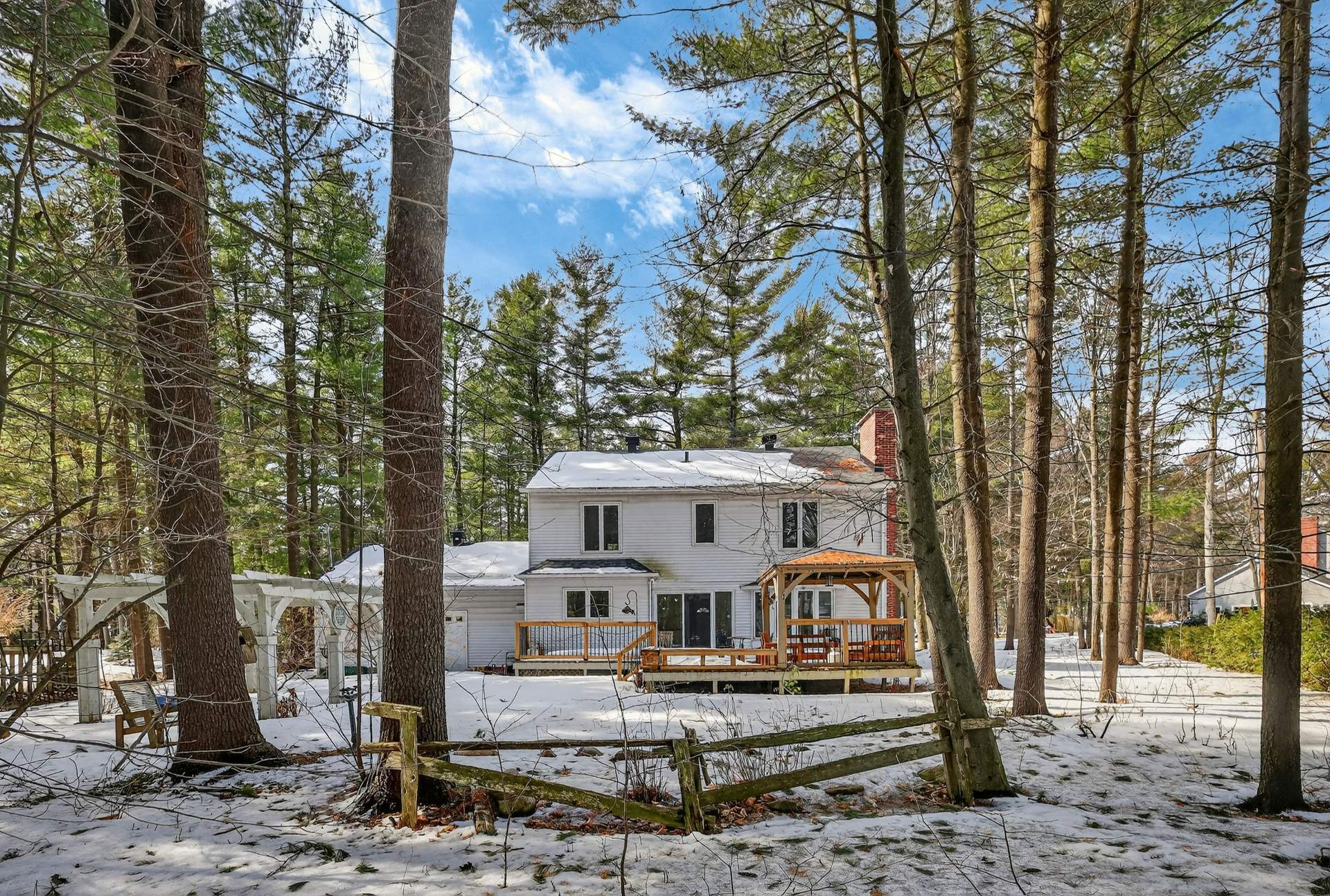 Beautiful Georgian-style home on a quiet crescent. Classic cross-hall layout, renovated kitchen with quartz counters open to the dinette and family room. Inviting main floor family room with exposed brick wall and fireplace. Dinette with patio doors to a private yard with deck and serene trellis area. Upstairs offers a spacious primary suite with walk-in closet and ensuite with jacuzzi tub and separate shower, plus two additional bedrooms and full bath. Unfinished basement with direct access to the double garage. Roof reshingled in 2024 , furnace and heat pump 2019.