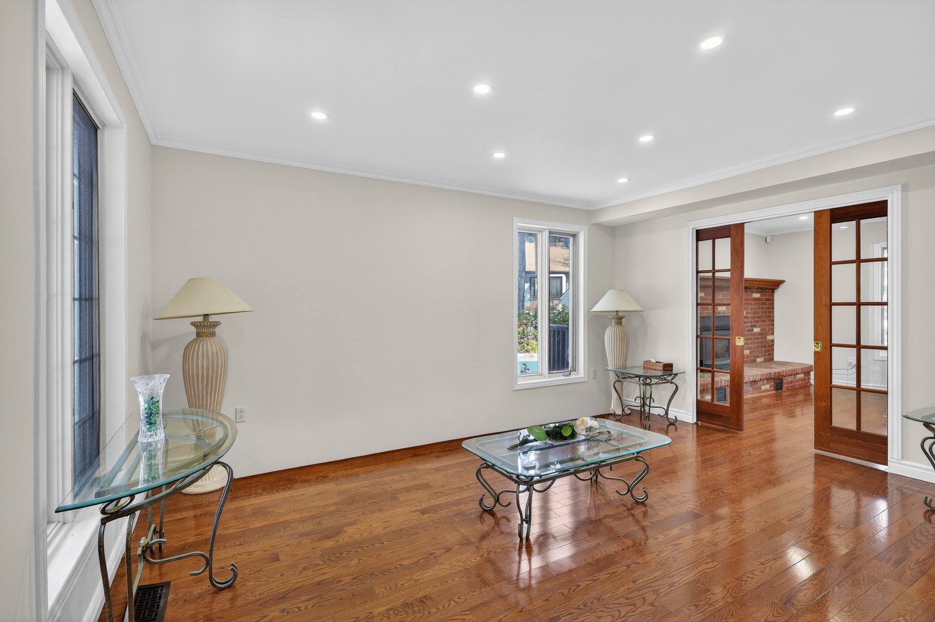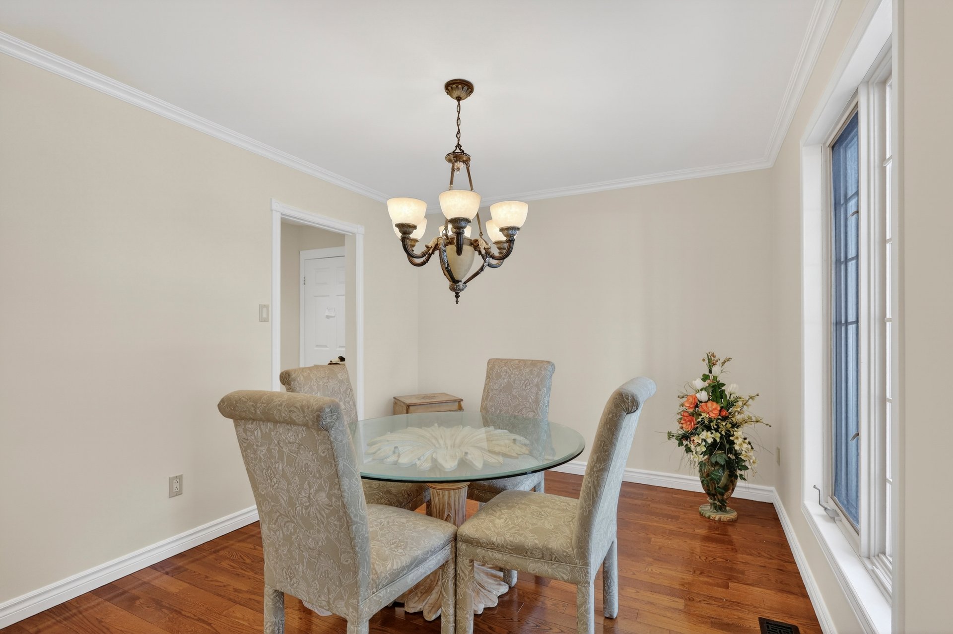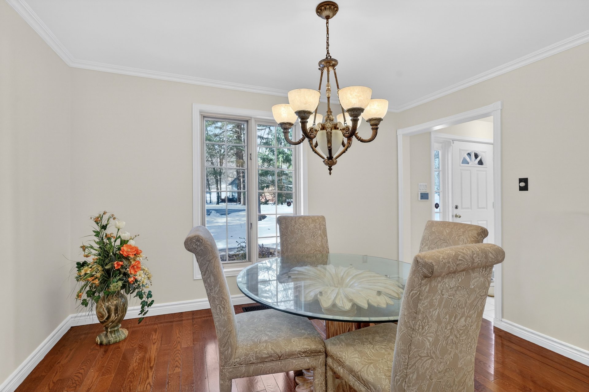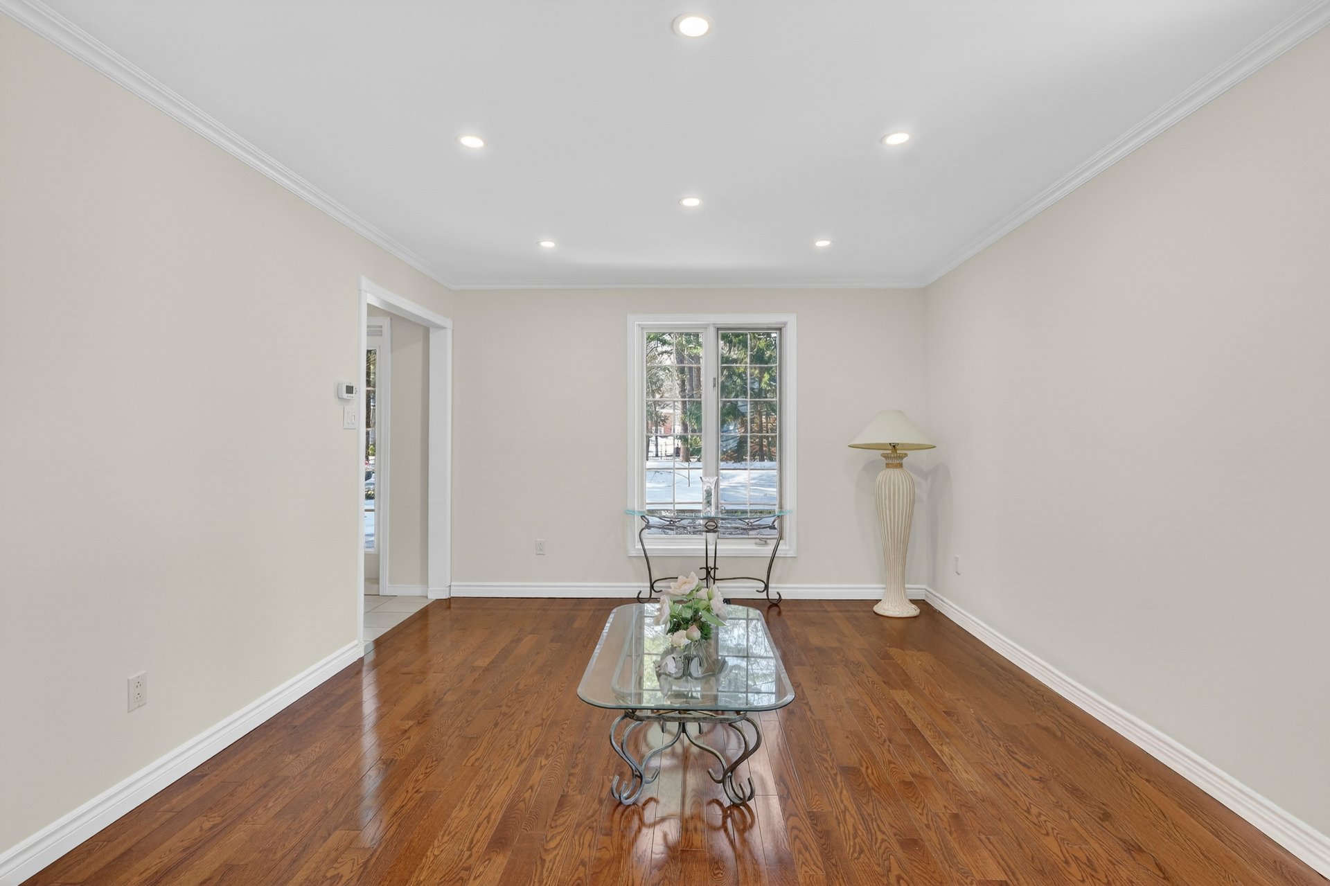 The home features a classic cross-hall floor plan with formal living and dining rooms, both appointed with hardwood flooring.
