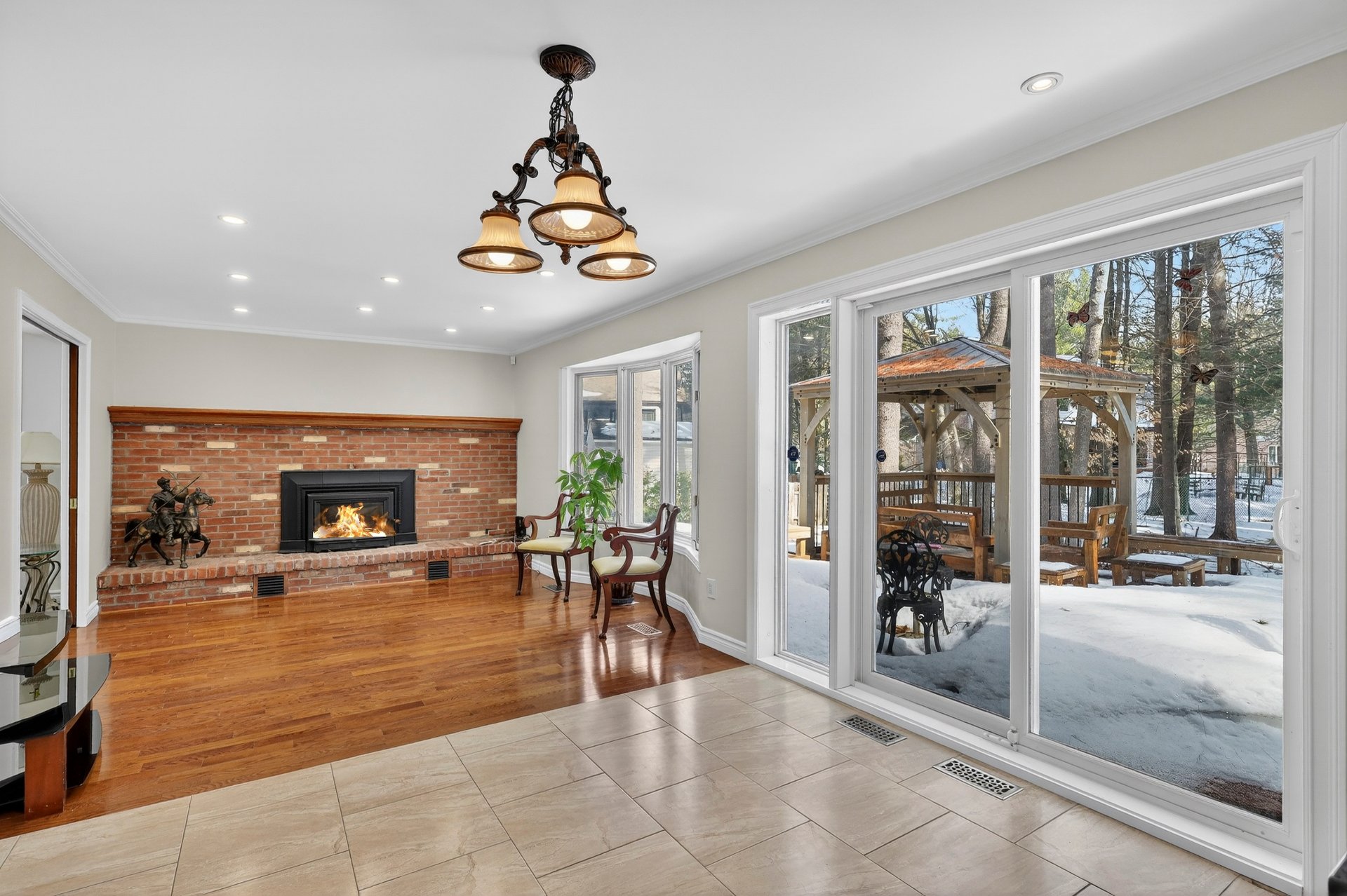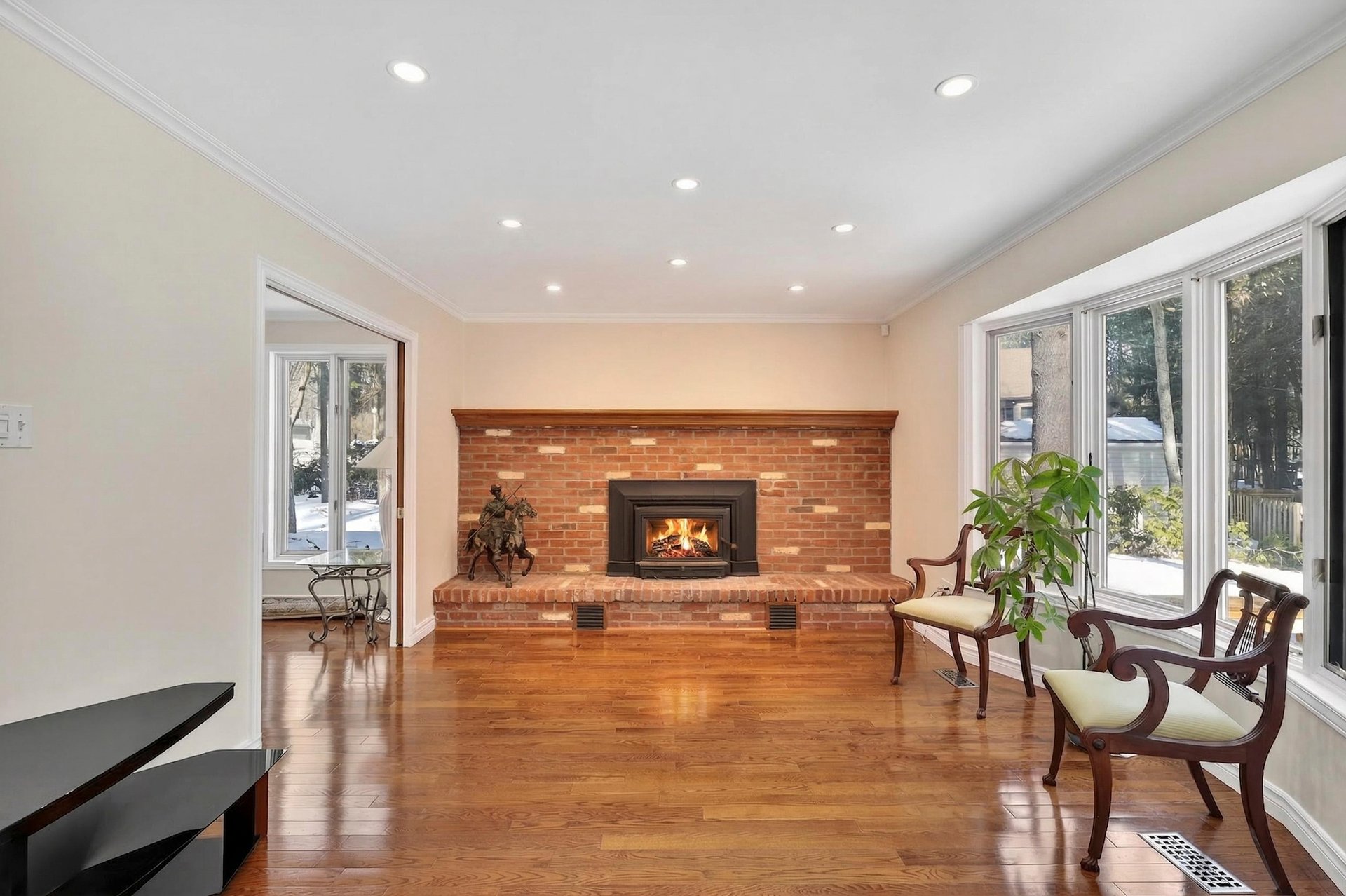 Adjacent to the dinette, the inviting family room features hardwood floors and a brick wall with a wood-burning fireplace, creating a warm and welcoming atmosphere.