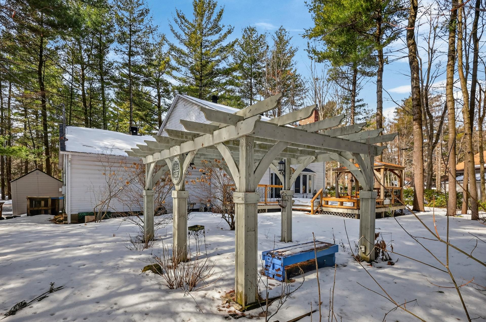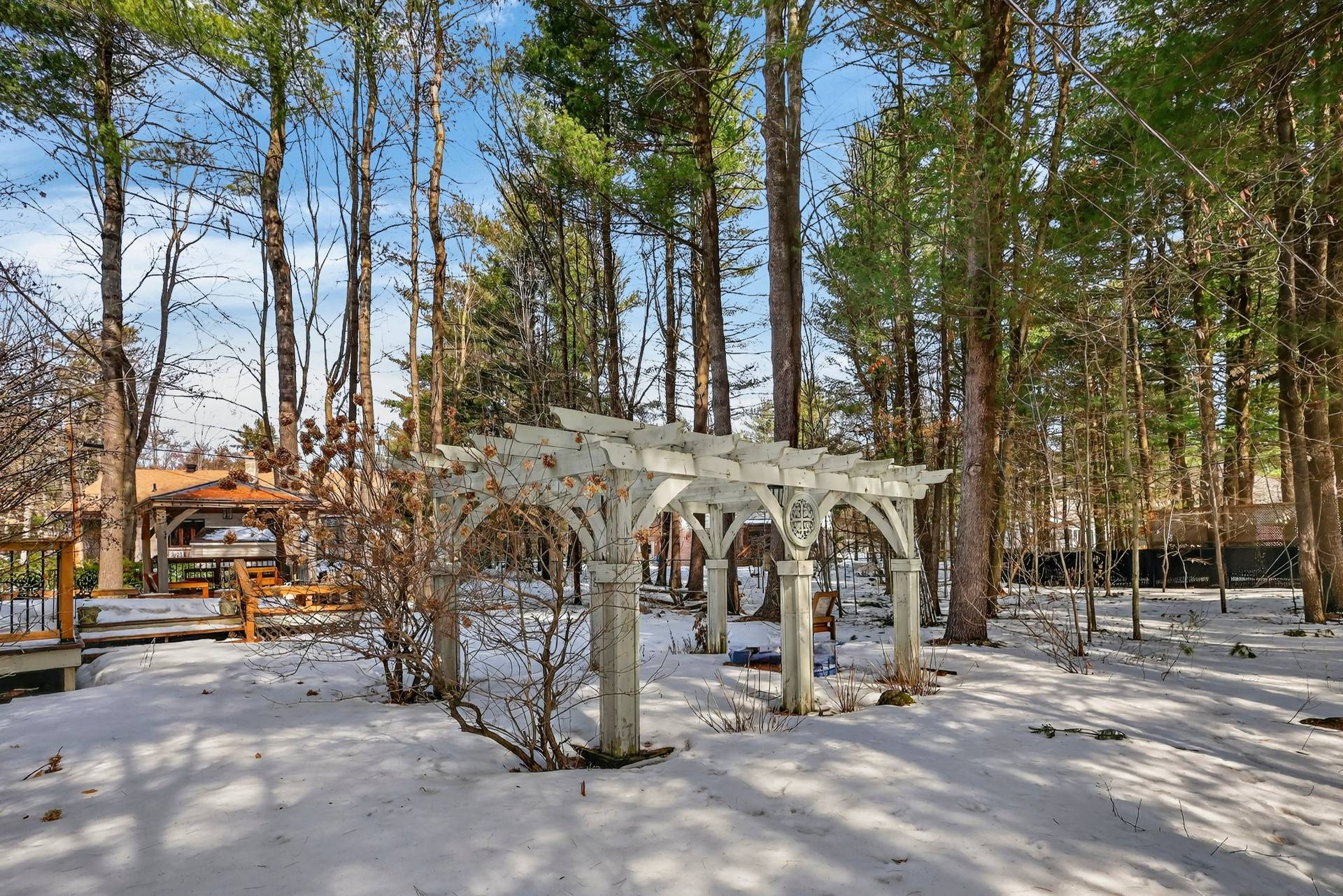 The dinette opens through patio doors to a large deck overlooking a pie-shaped backyard, complete with a charming trellis and patio stone area--perfect for outdoor enjoyment.