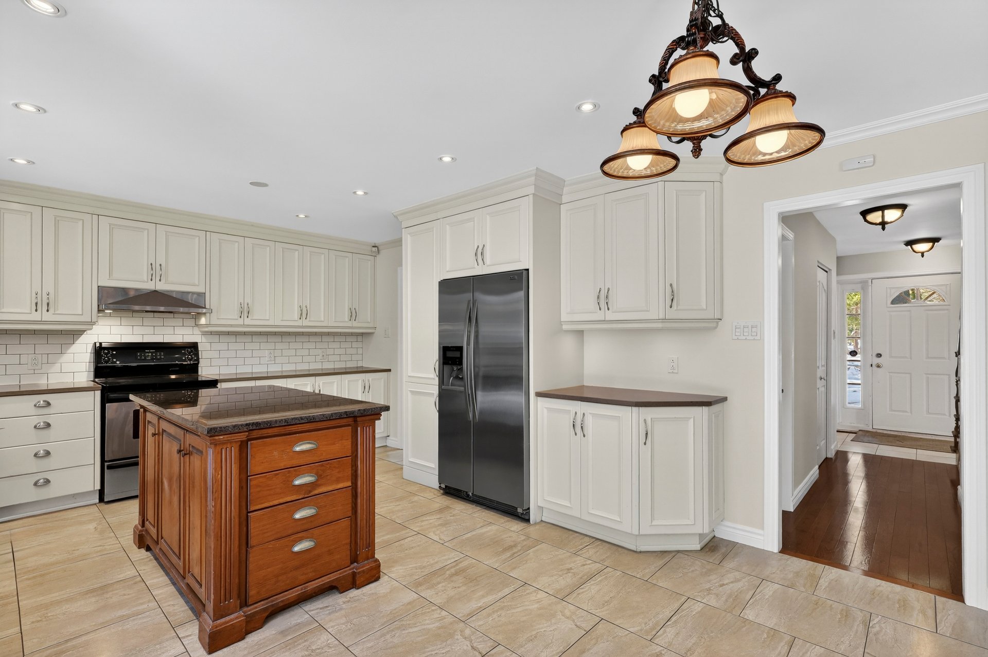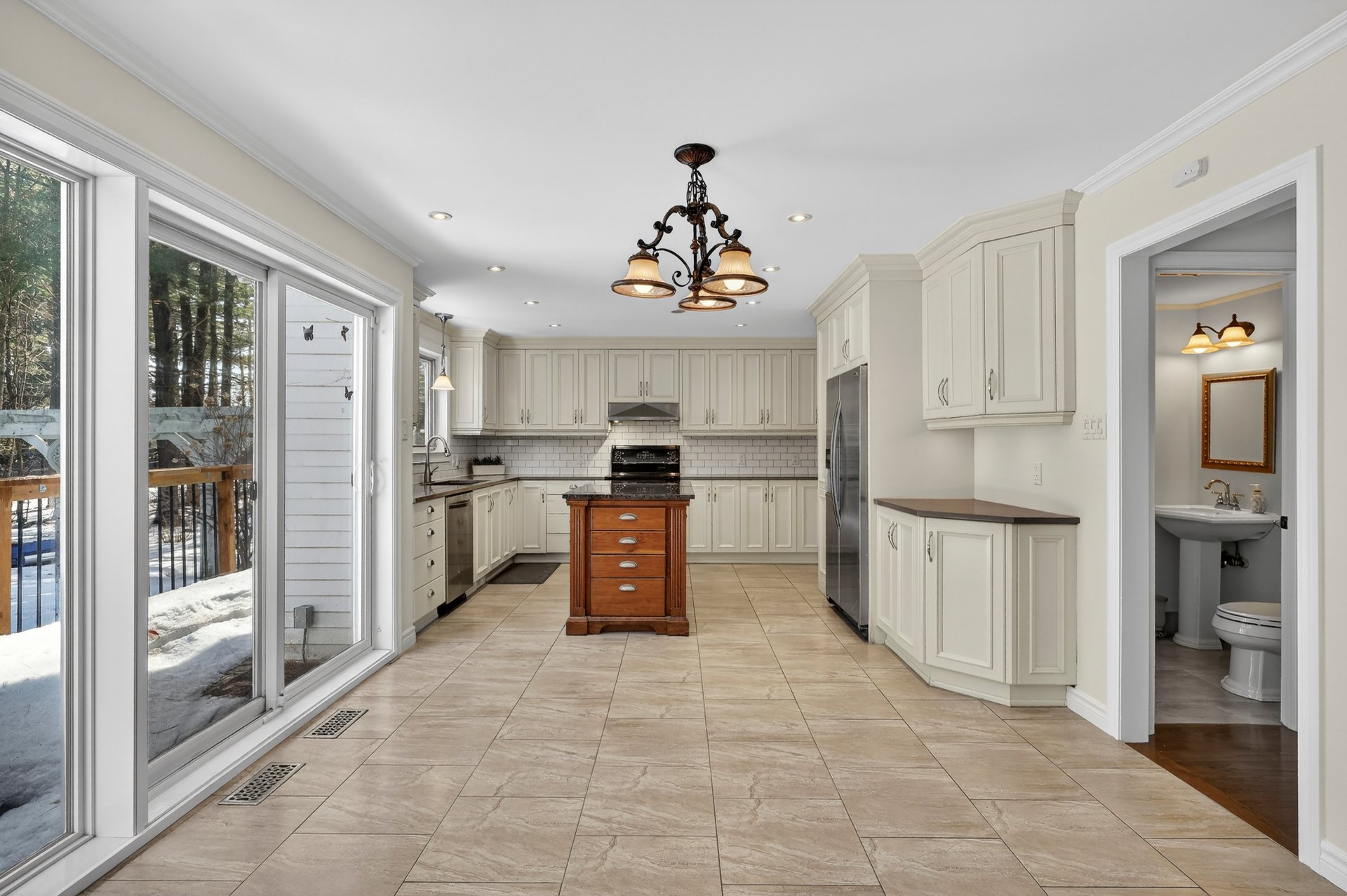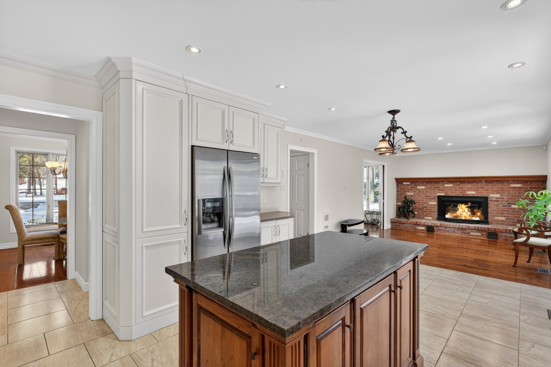 The renovated kitchen features quartz countertops, a center island, and seamless flow into the dinette and family room.